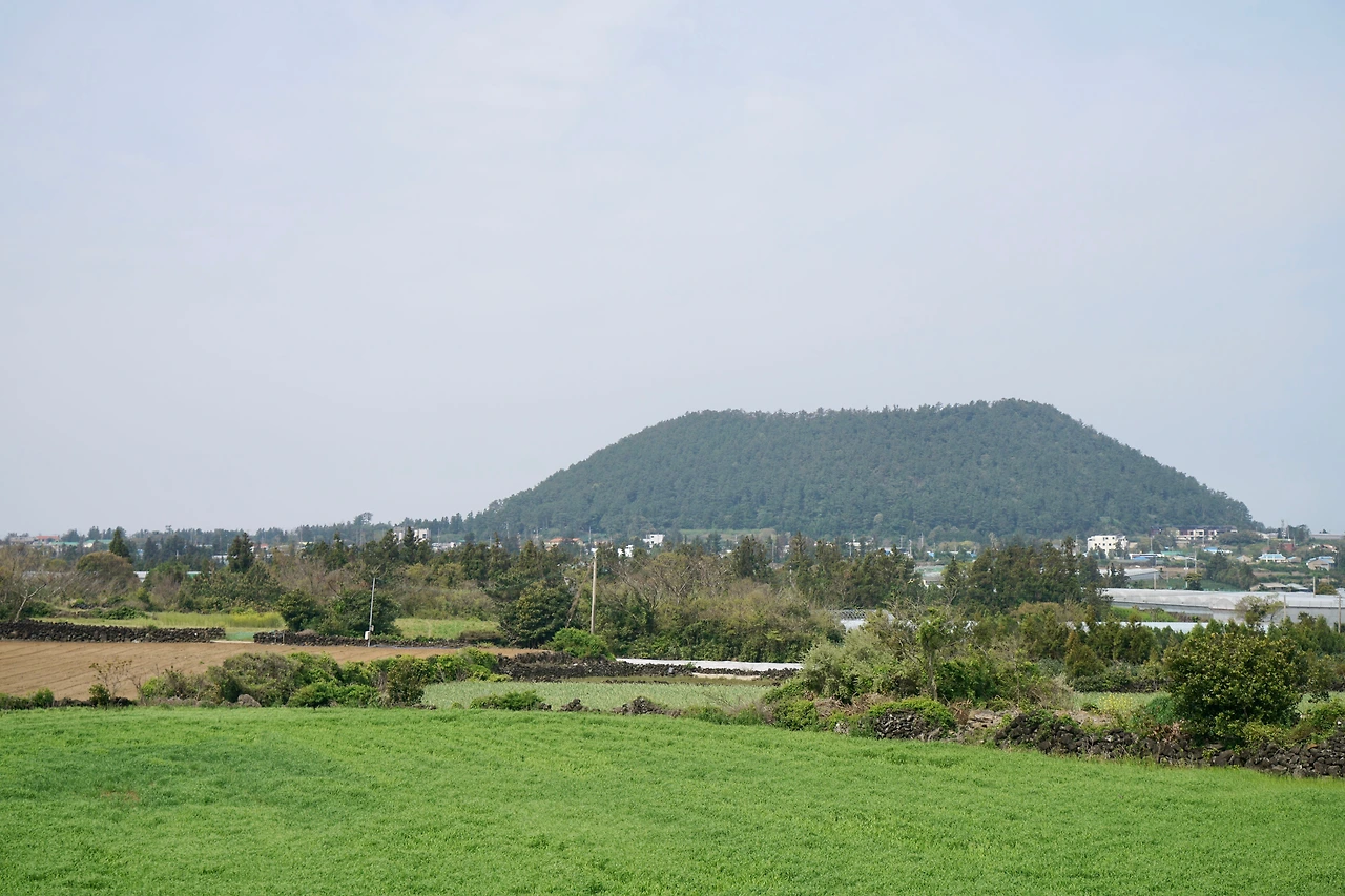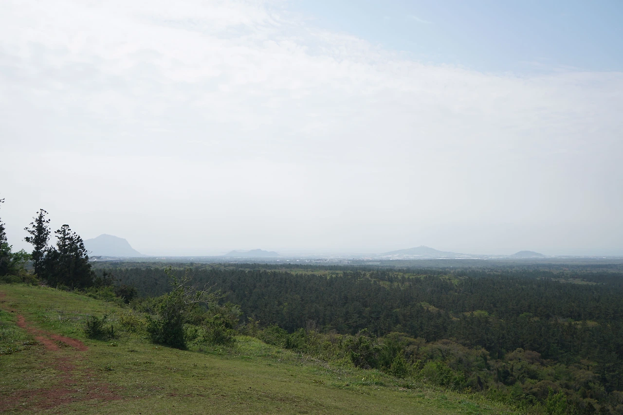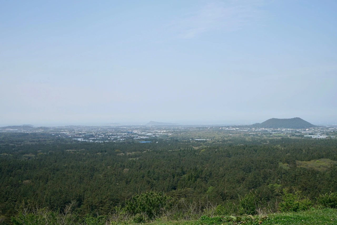 문도지오름 입구에 닿으니 말이 풀을 뜯고 있다. 문도지오름에는 말을 방목하는 목장이 있다. 어디나 마찬가지로 목장 입구에는 한 사람이 간신히 통과할 수 있는 출입구가 있다. 말이 통과할 수 없게 만든 트랩 형태의 통행로다. 문도지 오름은 완만하며 정상부는 초지로 되어 있다. 정상에서 멀리에 지나온 저지오름이 보이고 그사이에는 푸른 숲이 펼쳐진 곶자왈이 있다.
