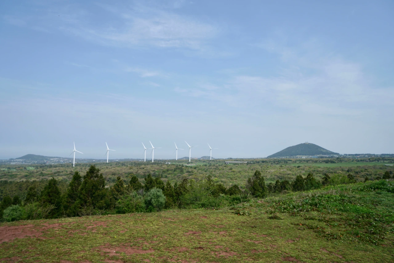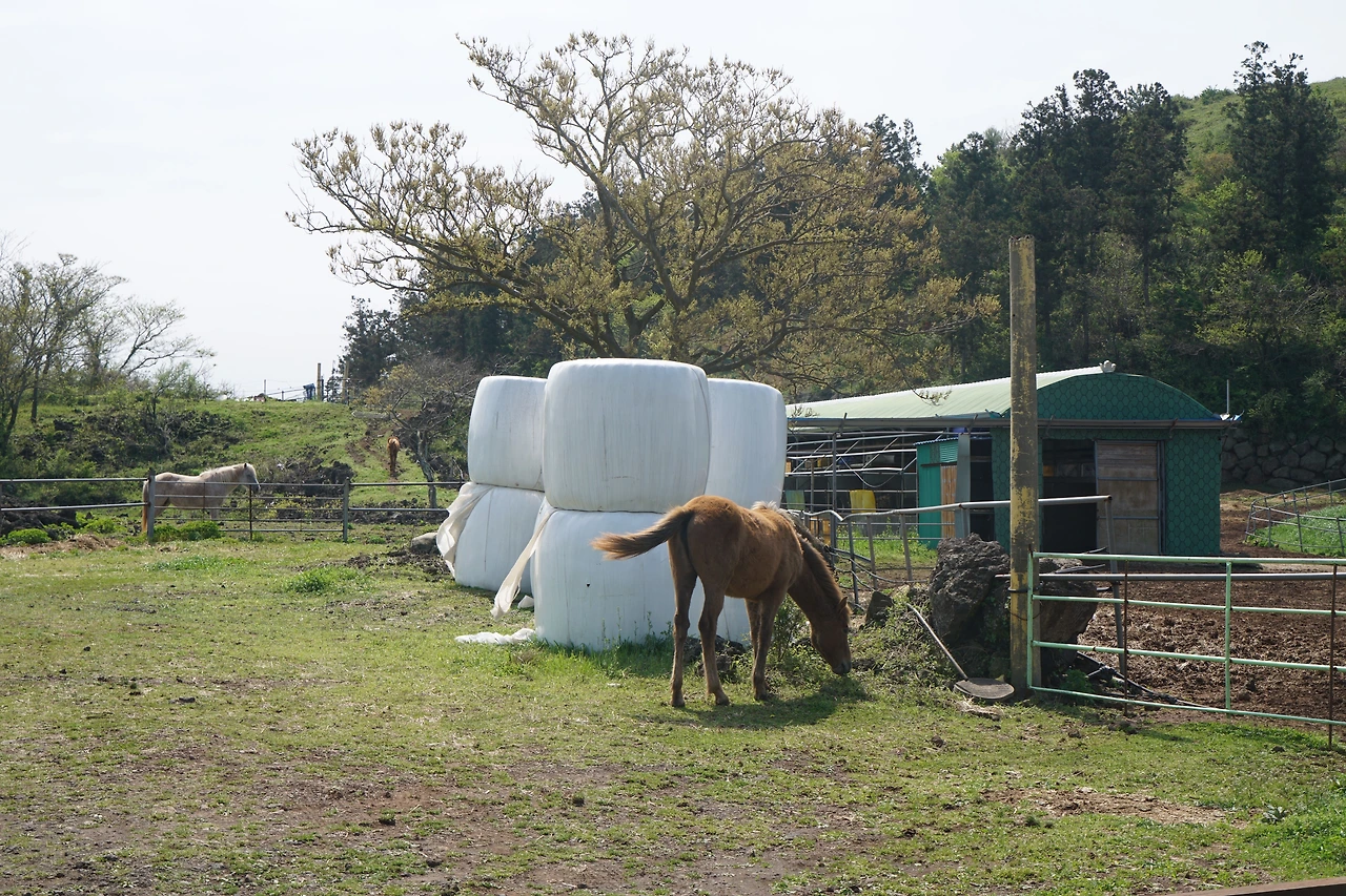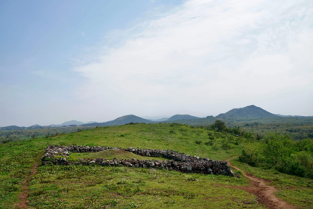 문도지오름 입구에 닿으니 말이 풀을 뜯고 있다. 문도지오름에는 말을 방목하는 목장이 있다. 어디나 마찬가지로 목장 입구에는 한 사람이 간신히 통과할 수 있는 출입구가 있다. 말이 통과할 수 없게 만든 트랩 형태의 통행로다. 문도지 오름은 완만하며 정상부는 초지로 되어 있다. 정상에서 멀리에 지나온 저지오름이 보이고 그사이에는 푸른 숲이 펼쳐진 곶자왈이 있다.