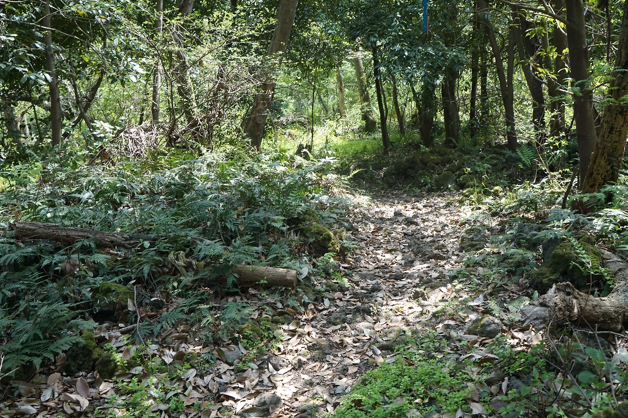 문도지오름을 내려서면 곶자왈 사이로 길이 이어진다. 곳은 숲이고 자왈은 자갈이다. 제주에는 곳곳에 곶자왈이 있다. 온대와 난대 식물이 동시에 자라기 때문에 학술적으로 가치가 높은 숲이다. 검은 현무암 자갈과 바위가 깔린 토양에 솟아나는 샘물로 인해 많은 식물이 빼곡히 섞여 자라고 있지만 역사적으로는 많은 사연을 가진 곳이기도 하다. 숲이 깊어 어려울 때마다 주민들과 반군 또는 토벌대의 근거지가 된 곳이기 때문이다. 이곳은 백서향의 자생지가 있어 2월에는 백서향의 향기가 가득하다고 한다.