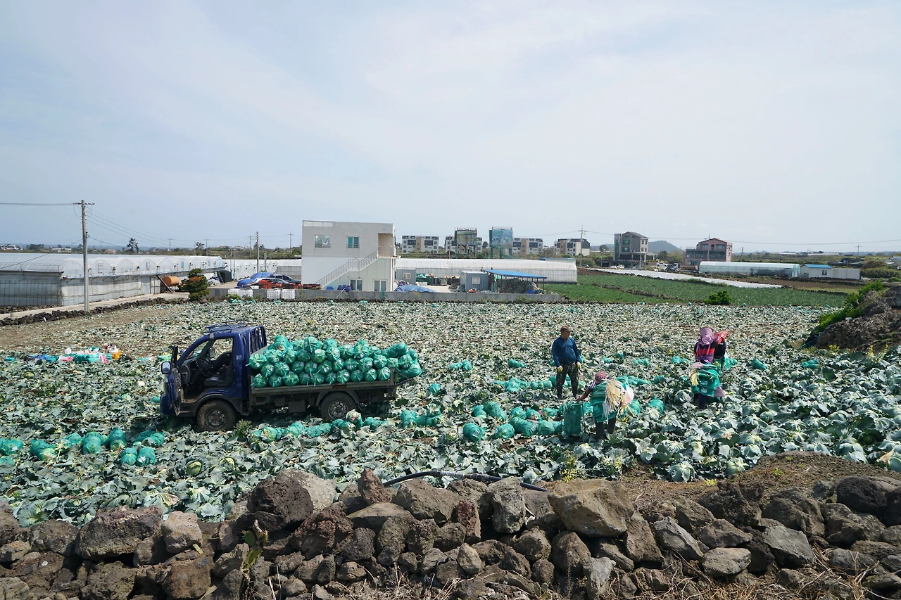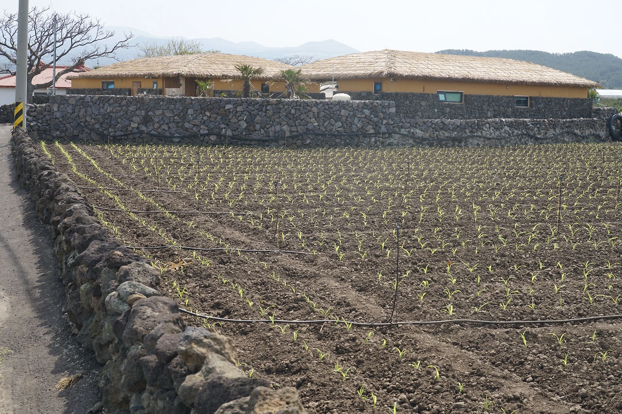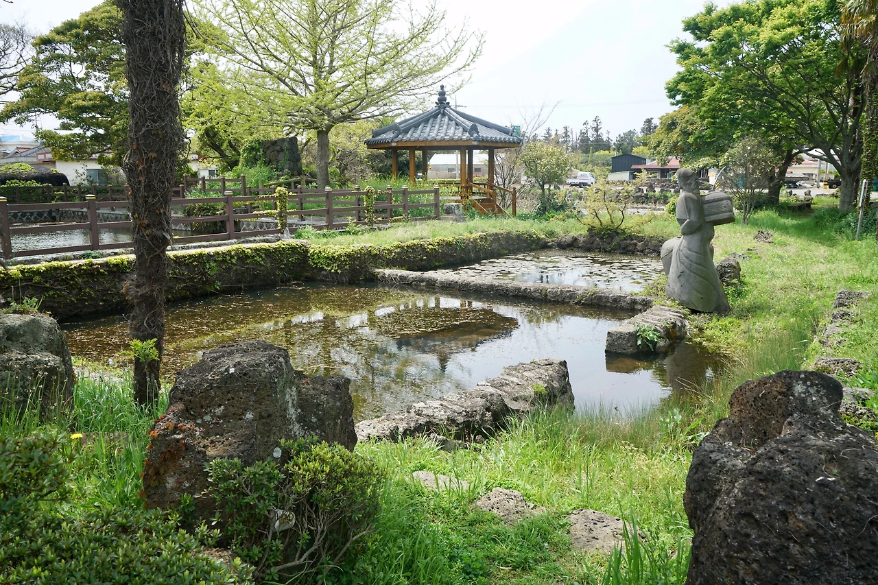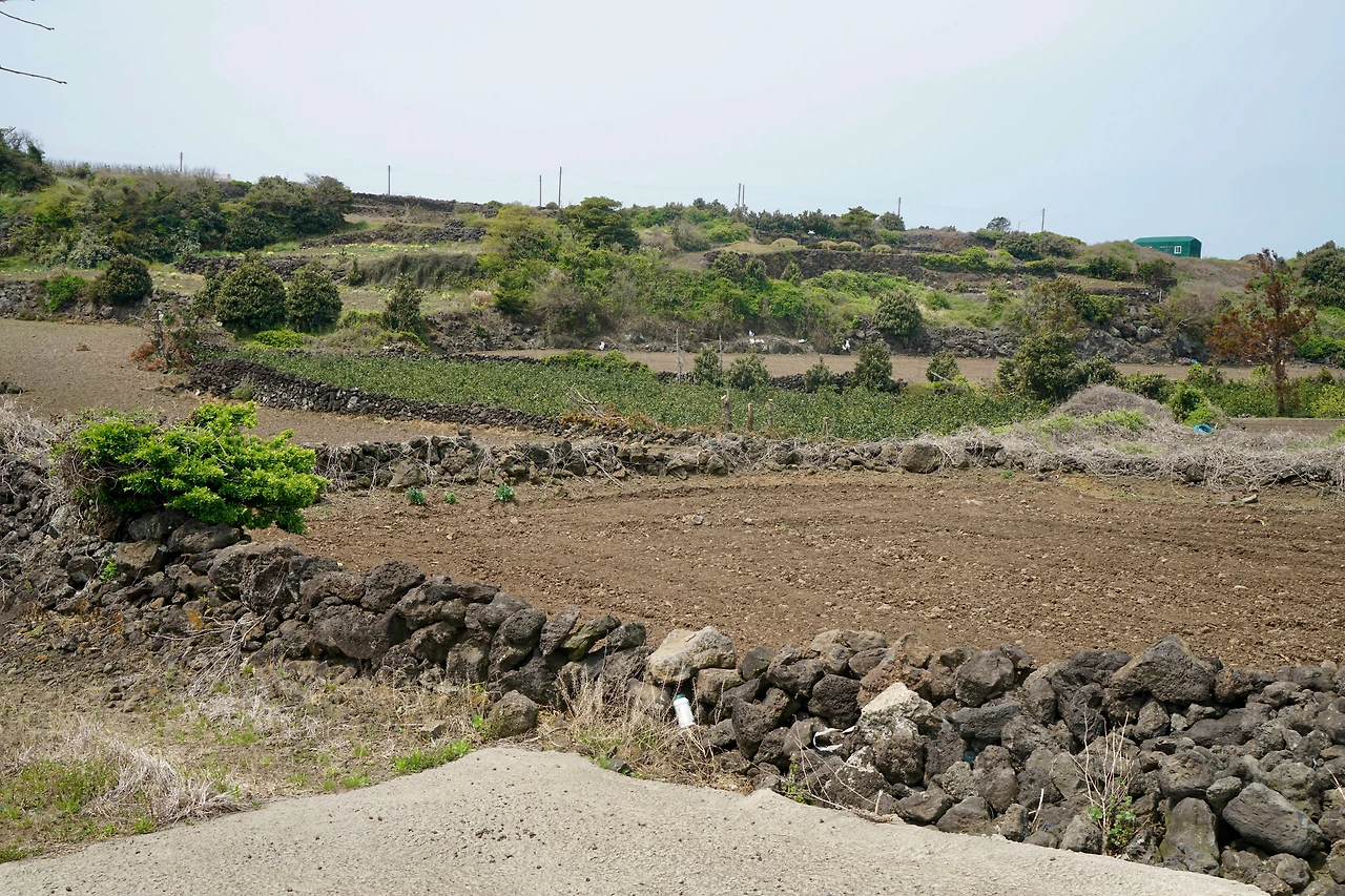 중산간 길은 어디나 비슷한 모습이다 숲이 아닌 곳은 돌담길 사이로 시멘트 포장길이 이어지고 곳곳에서 감귤 재배를 위한 비닐하우스가 있다. 밭에서 기르는 작물은 지역적으로 조금씩 바뀌는데 이번 구간은 양배추, 양파가 많다. 다른 곳과 마찬가지로 양배추는 수확하는 것보다 버려놓은 곳이 더 많다. 포장길을 따라 걷다 보니 영새샘물에 닿았다. 집을 짓기 위해 찰흙을 파낸 자리에 지하수로 물이 고여 연못이 생겼고 새들이 물을 먹으러 오는 곳이 되었다.