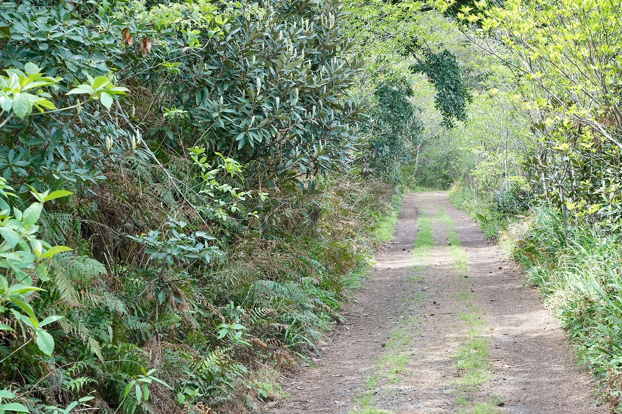 농로를 따라 이어지는 가파른 내리막을 내려와서 만나는 포장길을 따라면 간선도로다. 길가에 카페와 선물가게가 있는데 손님이 없어서인지 문은 닫혀 있다. 선물가게 앞 벤치에서 잠시 다리 쉼을 하였다. 이제 간선도로를 버리고 숲으로 들어서면 납읍 숲길이다. 포장길을 걷다가 숲길로 들어서니 흙의 부드러움이 발을 통해 전해진다.