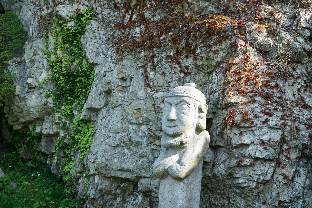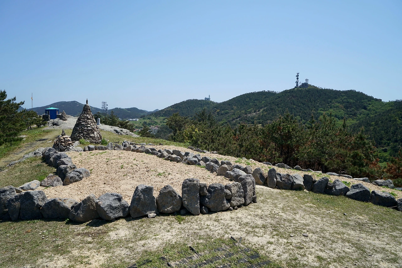 포구를 지나면 거대한 바위 아래 엄바위 장승이 있다. 부리부리한 눈에 팔짱을 낀 장승의 모습이 이채롭고 장승 뒤의 거대한 바위도 줄기식물이 자라 붙어 사람의 뒤통수를 보는 듯한 특이한 모습으로 서있다. 장승을 지나면 힘든 산길을 또 올라야 한다. 오르막길이 힘든 몸을 더 지치게 하지만 돈대산 정상에는 힘든 산행에 대한 보상이 기다리고 있다. 시원한 바람, 사방에 펼쳐지는 바다의 경치가 흘린 땀에 대한 보상이다. 경치에 취해 정상 팔각정에서 한동안 머물렀다.