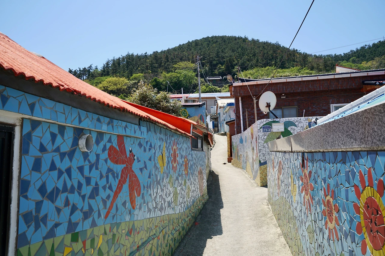 황경한의 묘를 지나 산길을 내려가면 몽돌해안이 나오고 시멘트 포장길이 해변을 지나 구불거리며 건너편 언덕을 넘는다. 언덕을 오르면 예초리 기정길이다. 망망대해가 펼쳐지며 그위에 점점이 섬들이 떠있다. 이 길을 걸으면 걷는 사람의 마음이 활짝 열린다. 시원한 바람과 바다경치에 매료되어 탄성이 절로 나온다. 예초리 기정 끝머리가 예초 포구다. 젓갈을 익히는 커다란 플라스틱 통이 곳곳에 널려 있다.