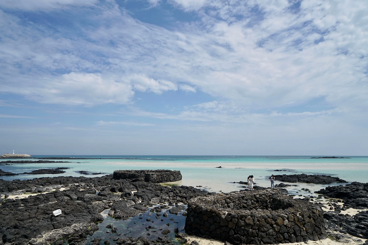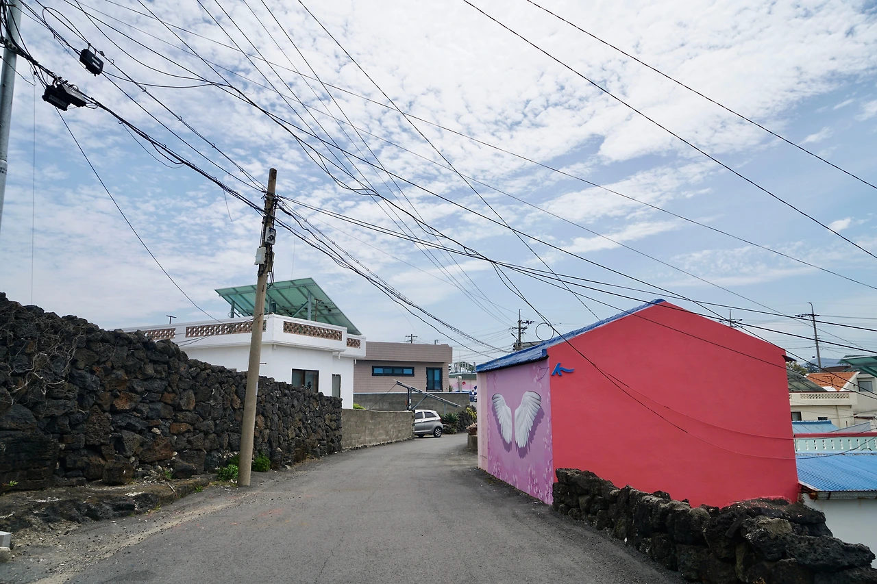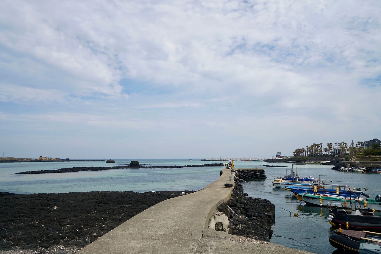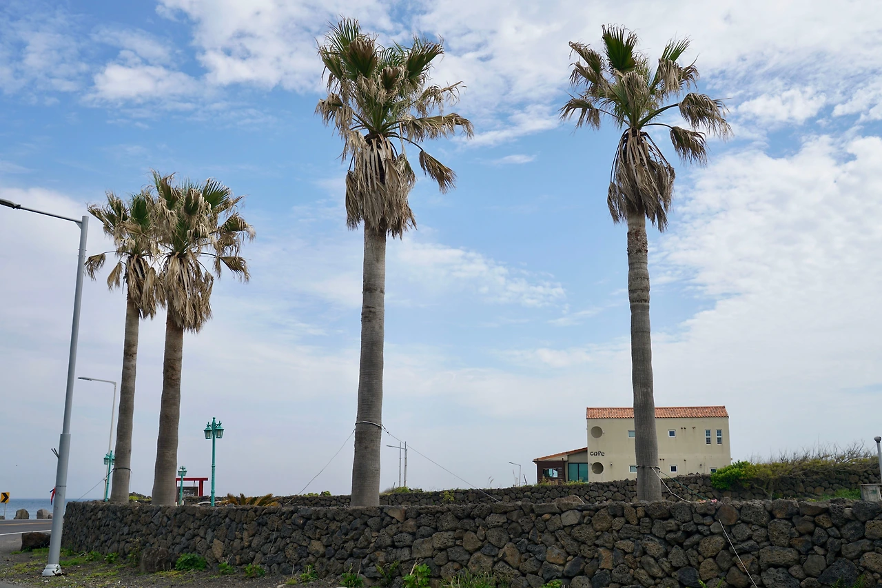 오던 길을 되돌아와 신흥리 마을 쪽으로 방향을 잡아 마을 좌측으로 넘어가니 함덕해수욕장 서쪽 끝이다. 활처럼 휘어진 해변 길은 다른 해수욕장에 비해 건물이 많이 들어서 있다. 대부분의 건물을 숙박시설과 식당, 카페가 차지하고 있다. 해변과 차도를 분리하고 파도가 넘어오는 것을 막기 위해 설치한 해변의 벽 위에는 젊은 여성들이 바다를 배경으로 사진을 찍고 있다. 인생 샷을 위해서 라지만 위험해 보인다.