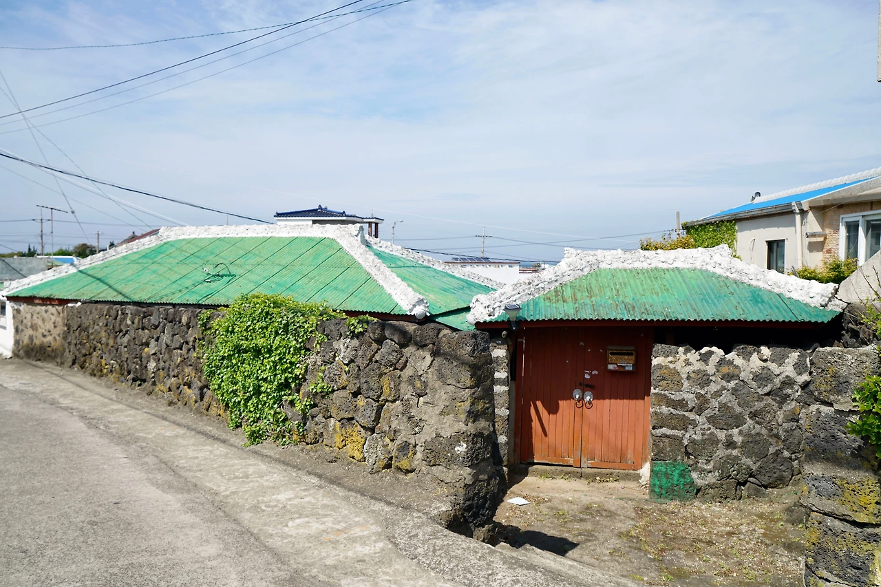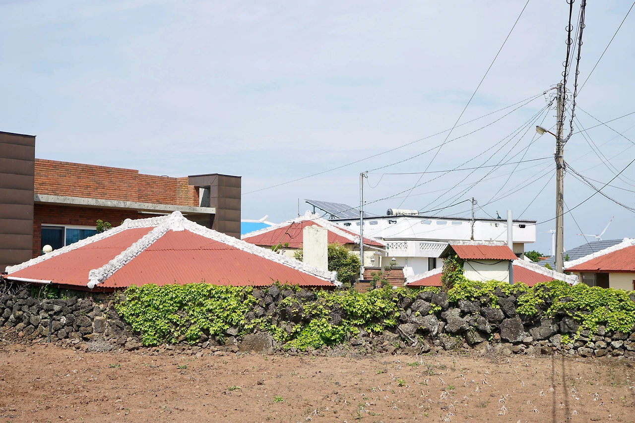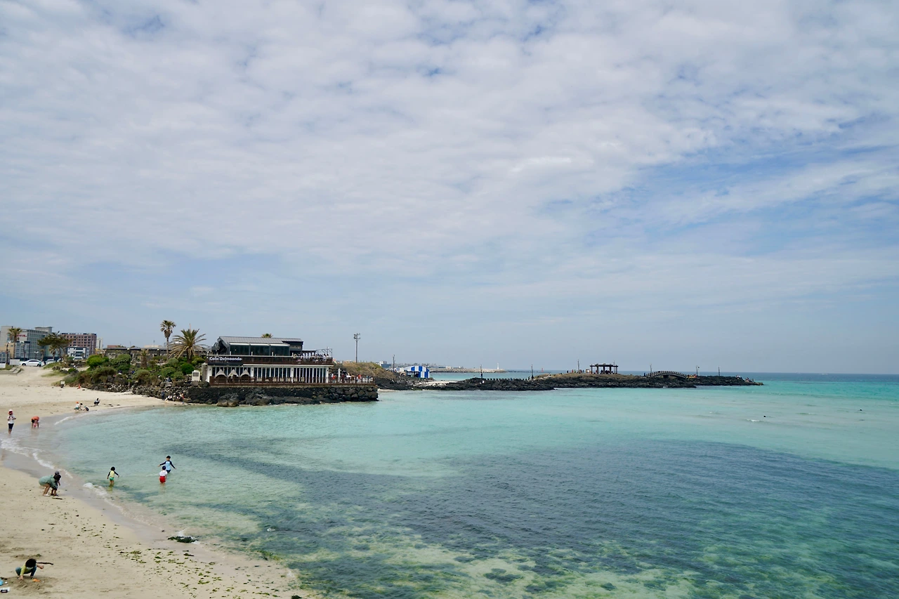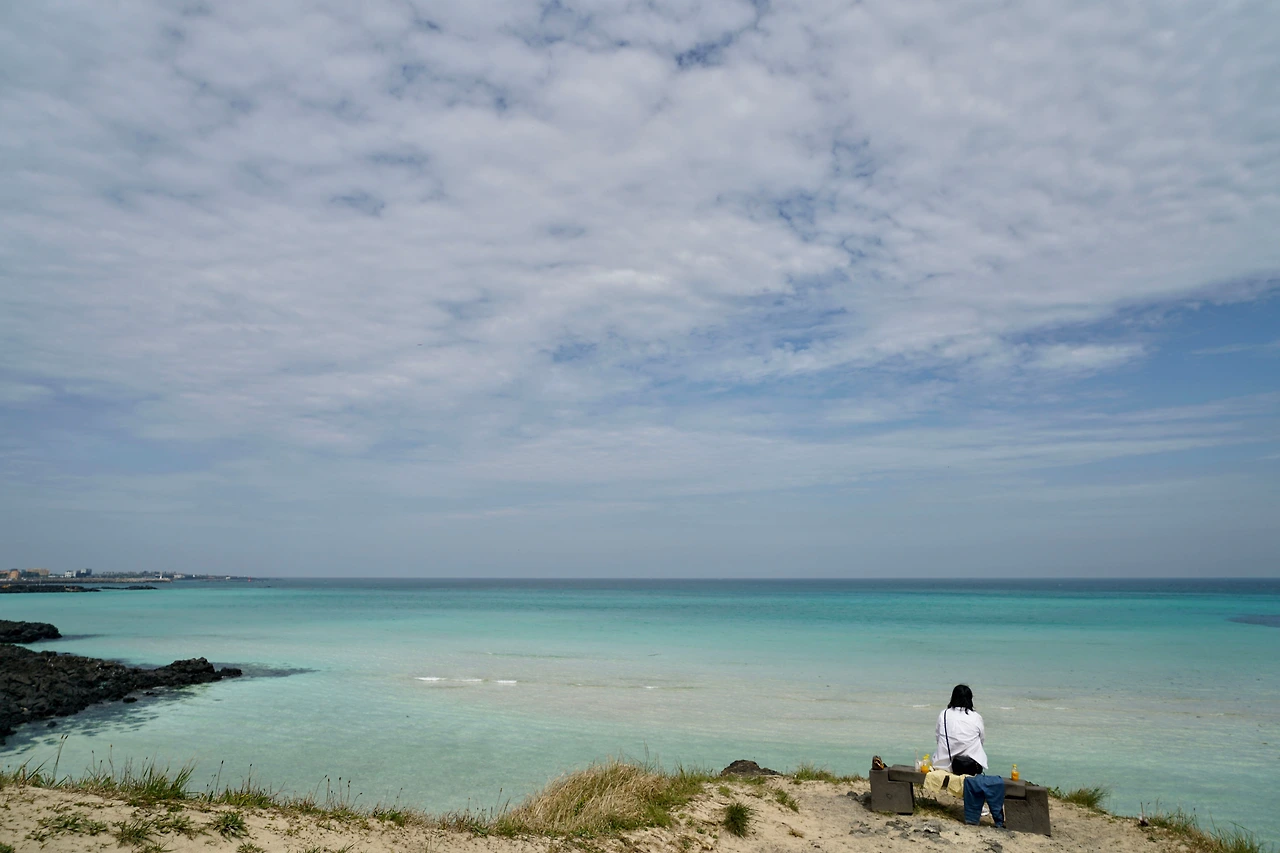 오던 길을 되돌아와 신흥리 마을 쪽으로 방향을 잡아 마을 좌측으로 넘어가니 함덕해수욕장 서쪽 끝이다. 활처럼 휘어진 해변 길은 다른 해수욕장에 비해 건물이 많이 들어서 있다. 대부분의 건물을 숙박시설과 식당, 카페가 차지하고 있다. 해변과 차도를 분리하고 파도가 넘어오는 것을 막기 위해 설치한 해변의 벽 위에는 젊은 여성들이 바다를 배경으로 사진을 찍고 있다. 인생 샷을 위해서 라지만 위험해 보인다.