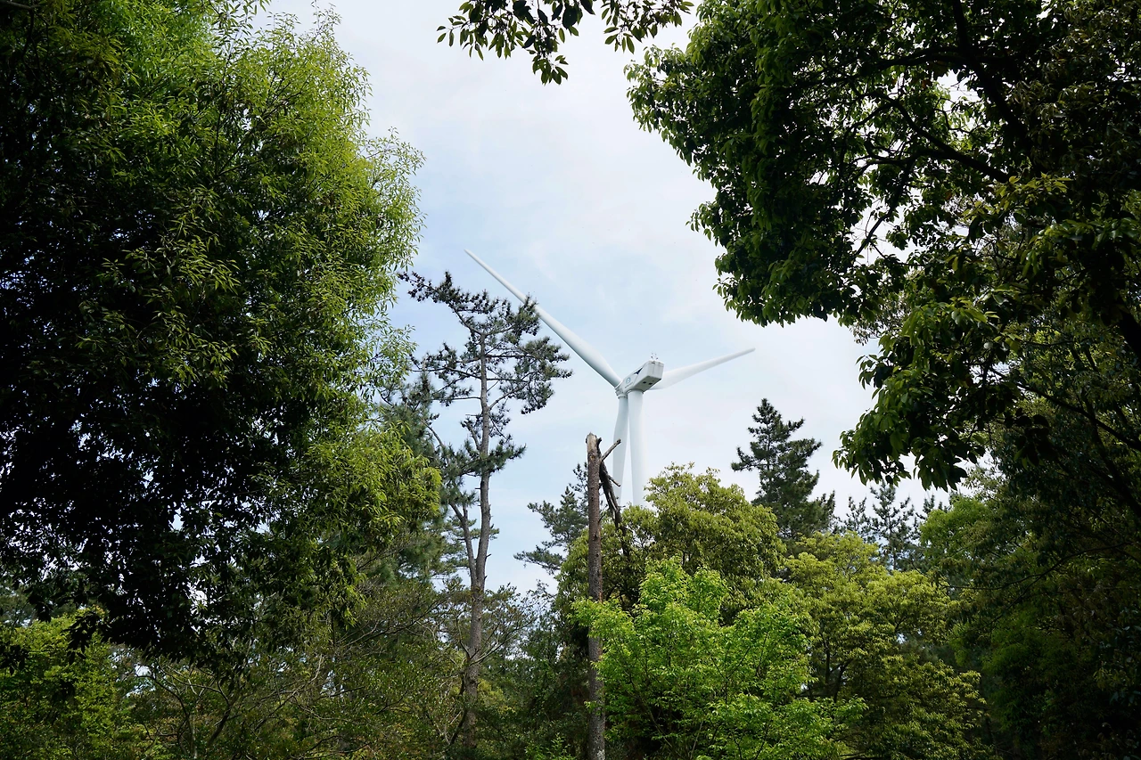 벌러진 동산이라는 간세다리 안내판이 나오고 나무가 우거진 숲길에 들어서면 머리 위에서 도는 풍력발전기의 바람소리가 숲의 고즈넉함을 앗아간다. 이 숲 주위에는 날개 회전 직경이 87미터이고 용량이 2MW인 풍력발전기 15기가 설치되어 있다. 풍력발전기 설치와 유지보수를 위해 시멘트 포장길이 숲을 관통하고 있어 또 한 번 한숨이 나오지만 곧이어 곶자왈 숲길로 들어서니 한낮인데 어두울 정도로 숲이 우거져 아직 자연이 살아 있는 것 같아 반가웠다. 혼자 다니기엔 너무 호젓한 길이다.