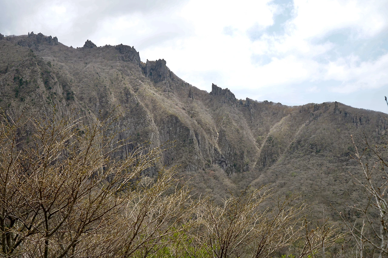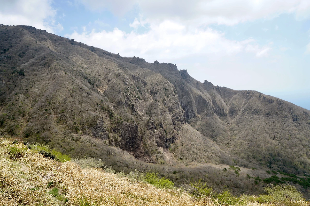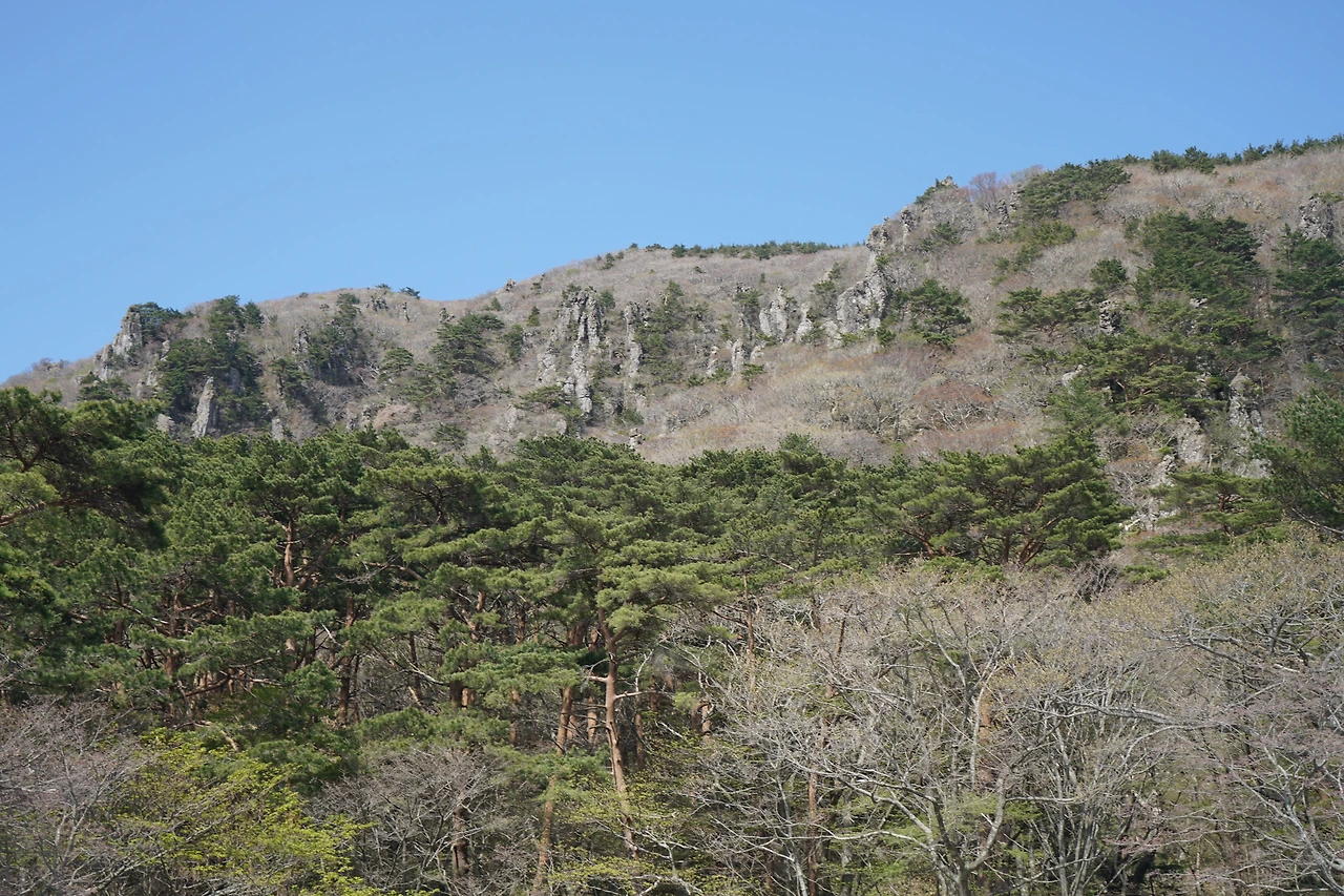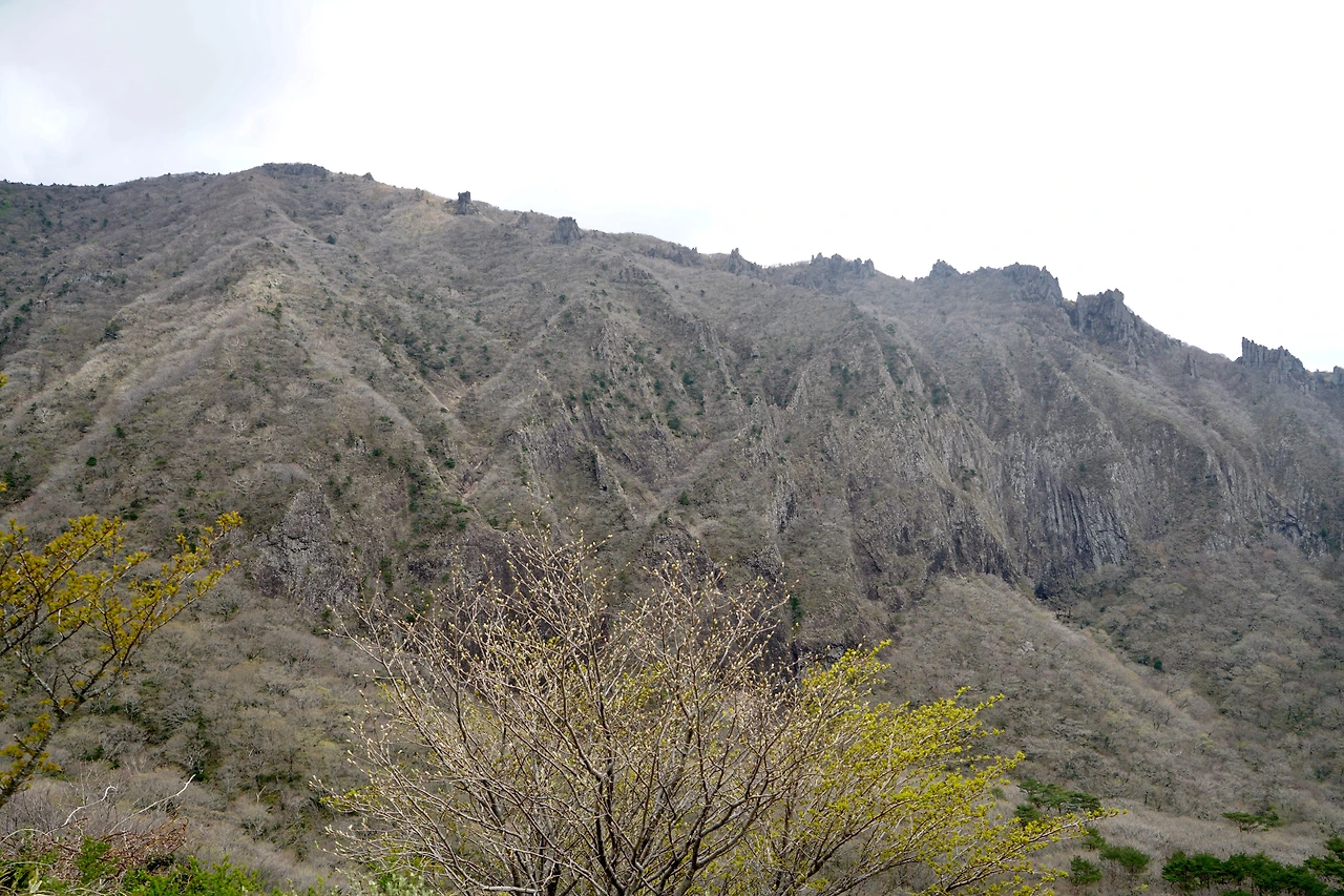 소나무 숲에서 시작된 등산길은 1km 정도 완만하게 오르다 가파른 오름길이 시작된다. 등산길 옆 능선은 499개의 설문대 할망의 아들들이 굳어서 된 바위로 가득하다. 금강산의 일만 이천봉 중 일부가 드문드문 능선에 내려앉은 느낌이다.