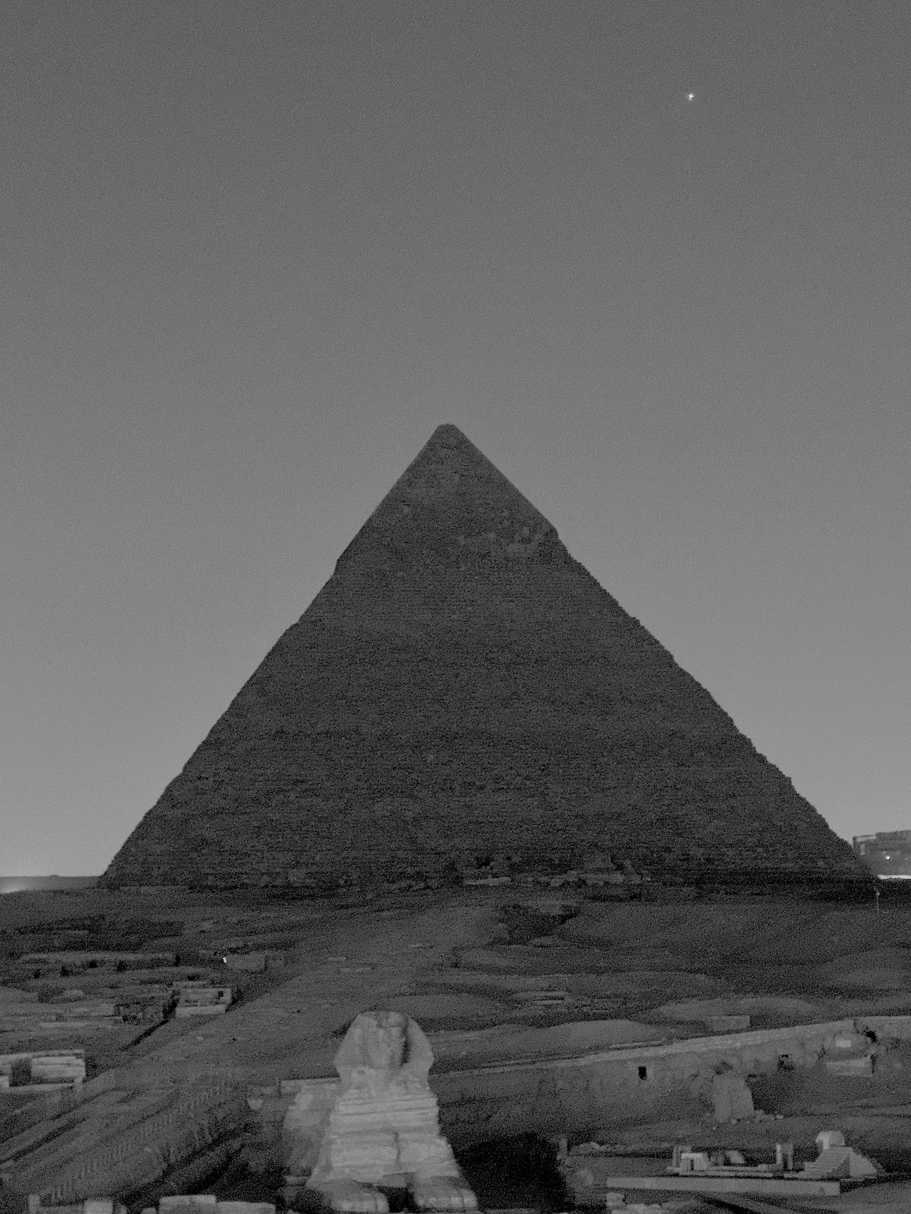 피라미드는 절대 권력자인 왕의 죽음을 상징하는 구조물이다. 어두워진 하늘을 배경으로 서있는 피라미드 뒤로 샛별이 떠 있고 피라미드 앞에는 그 사후세계를 지키려는 듯 스핑크스가 눈을 부릅뜨고 서 있다. 낮에 본 스핑크스와는 달리 조명 탓에 그렇게 보인다. 피라미드의 수호신이며 그곳에 묻힌 주인공을 묘사한 머리에 사자의 몸통을 가진 스핑크스는 절대적이지만 죽음을 피할 수 없는 왕권을 상징한다. 기껏 100년을 못 채우고 자연으로 돌아가는 인간이 수천 년을 변함없이 한자리를 지켜온 거대한 피라미드와 스핑크스를 만들었다. 불가사의한 일이다. 어둠이 내리자 샛별이 피라미드 뒤에 모습을 드러냈다. 46억 년 전 지구와 함께 생겼을 샛별과 수천 년 그 자리에 있어온 피라미드를 바라보니 찰나의 순간을 살아가면서 욕망에 이끌리는 나 자신을 돌아보게 된다.