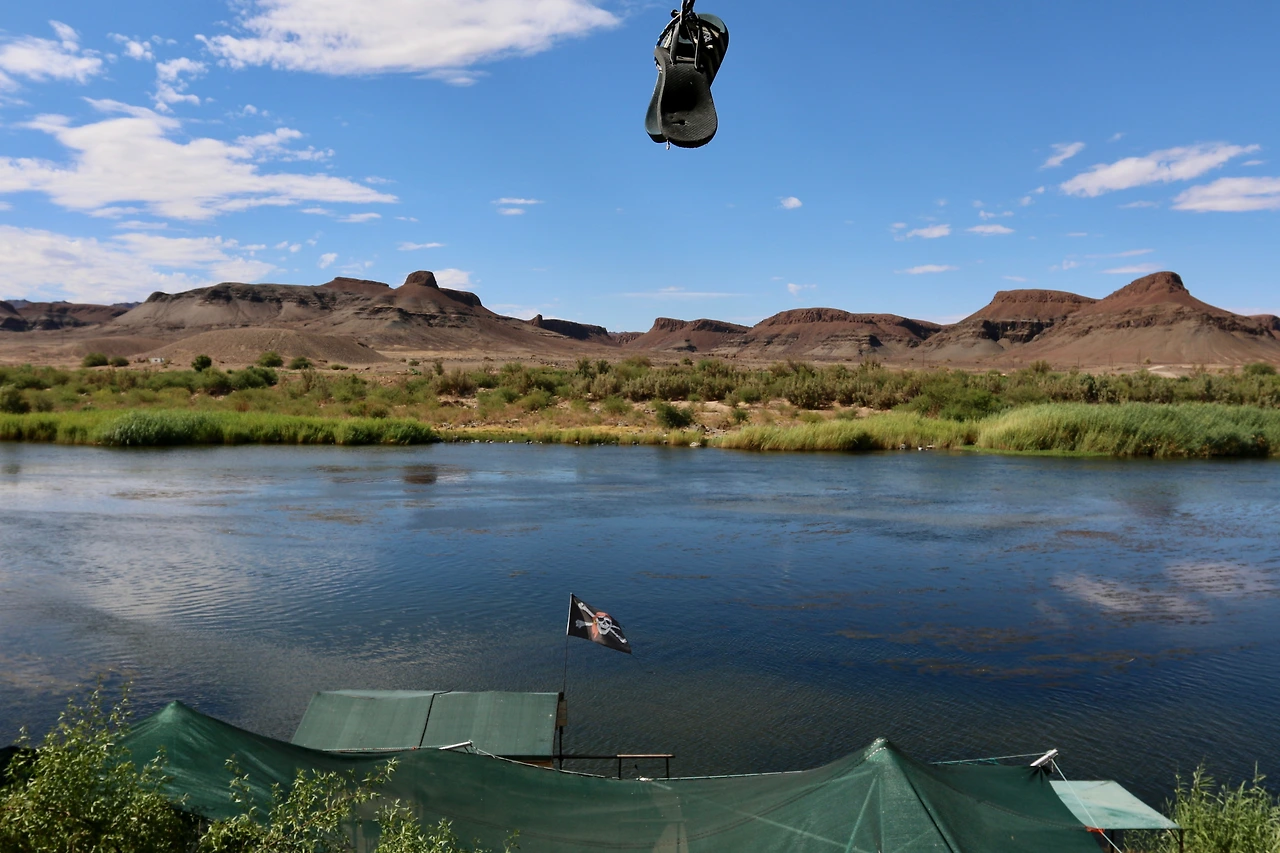오늘도 점심은 길 위에서 먹는다. 아보카도와 마요네즈를 버무려 햄버거빵에 넣어서 만든 아보카도 샌드위치다. 점심 후 트럭은 계속 북쪽으로 올라간다. 오늘 밤을 지낼 캠프 사이트까지는 75km 다. 줄곳 달려 오후 3시 20분에야 나미비아 국경 근처의 부시와키드 캠프에 도착했다. 캠프는 강 옆에 있는데 강 건너가 나미비아 땅으로 강이 나미비아와 남아프리카 공화국의 국경선이다. 나미비아는 1990년에 남아공으로부터 독립하였다.