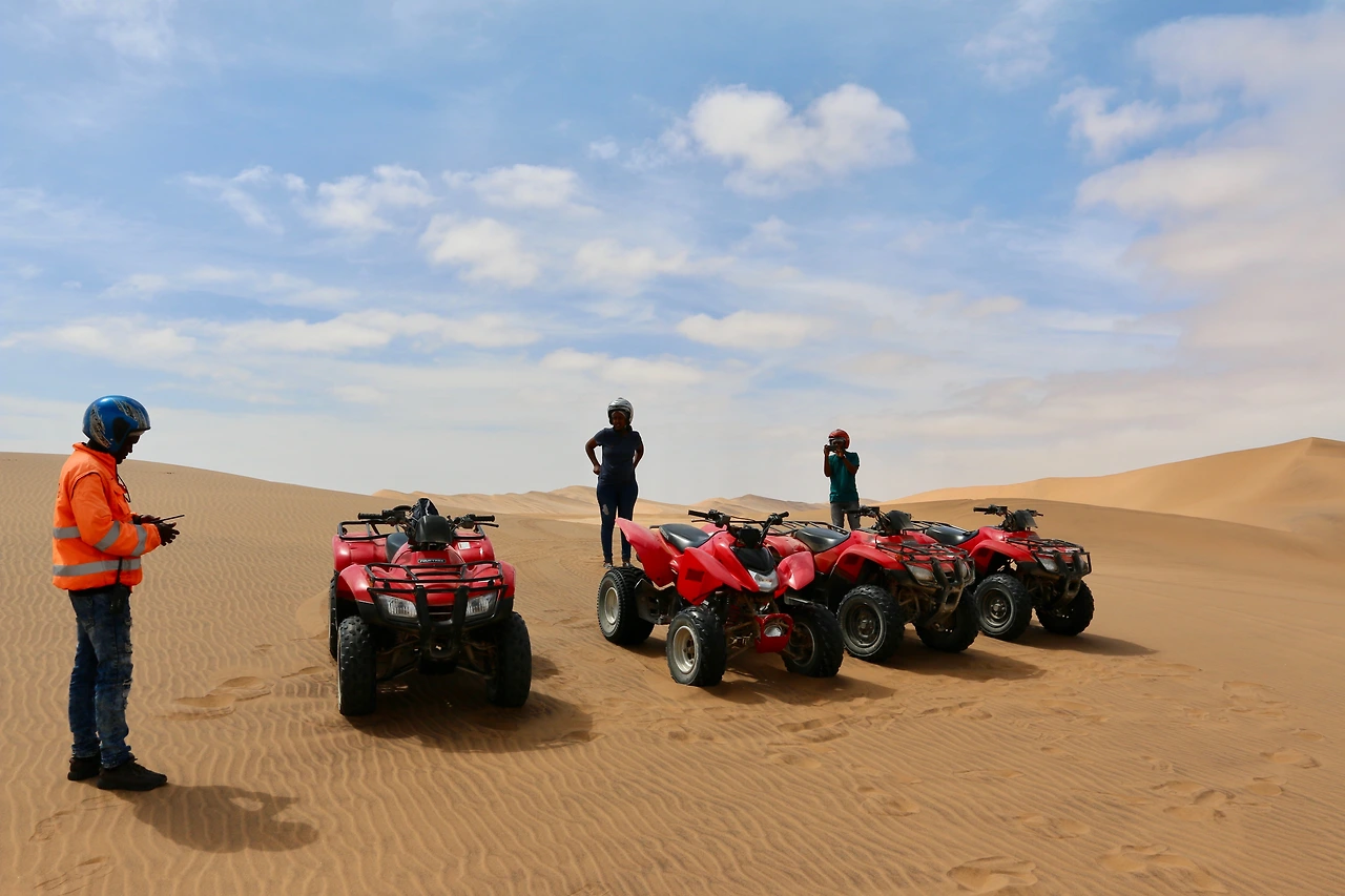 텐트에서 자다가 방에서 자니 잠을 더 편안히 잘 것 같은데 어제 술을 많이 마신 탓인지 새벽에 깨서 한참 뒤척거리다가 깊은 잠을 못 잤다. 하늘에 구름이 잔뜩 끼여 있다. 스카이다이빙 하는 날인데 구름이 많으면 어쩌지 걱정하며 무파로가 주차된 곳으로 가서 토스트와 후라이드 에그로 아침을 먹었다. 오전 10시로 예정된 스카이다이빙을 나서려고 준비를 하는데 날씨가 흐려 오후 2시로 연기되었다고 한다. 갑자기 오전에 할 일이 없어져 어제 고민하던 쿼드 바이크를 1시간짜리로 신청해서 탔다. 1시간에 450 나미비아 달러다. 나를 포함 중동에서 온 커플 이렇게 3명이 가이드를 따라 헬멧을 쓰고 쿼드 바이크를 몰고 사막으로 나갔다. 사막에는 쿼드 바이크가 다니는 길이 정해져 있었다. 다른 팀들도 그 길을 따라 바이크를 타고 다닌다. 바이크는 자동으로 세팅되어 있어서 기어를 바꿀 수 없고 브레이크와 악세레이터만 조정할 수 있다. 안전문제로 최고 속도를 제한해 놓은 것이다. 사막의 모래밭에서 달리는 바이크는 예상했던 것보다는 익사이팅한 맛이 없다. 길을 벗어나거나 오르막에서는 바퀴가 쉽게 모래에 박힌다. 중동에서 온 커플은 그나마 속도를 내지 못해 빨리 달릴 수가 없다. 사막 한가운데에서 잠시 쉬면서 가이드가 모래언덕에서 펼치는 묘기를 잠시 감상한 후 액티비티 센터로 돌아왔다. 한 시간만 타기를 잘했다는 생각이다.