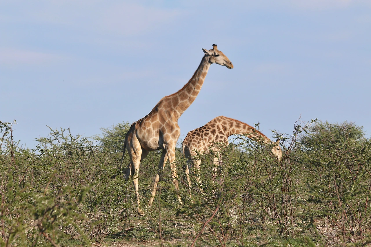에토샤 국립공원은 넓이가 22,000평방 km이다. 사방이 지평선만 보이는 넓은 초원으로 동물들이 서식하기에 알맞은 곳이다. 사방이 열린 짚을 타고 동물을 찾아다니는데 가장 많이 보이는 동물은 기린과 영양의 일종인 임팔라, 누우 정도이다. 공원에 들어서자마자 우측에 수사자 한 마리가 초원에 엎드려 주위를 살피고 있다. 사자를 쉽게 만나다니 운이 좋은 편이다. 그런데 거리가 멀어 줌 렌즈로 최대한 당겨 찍어도 사자의 표정을 잡기는 어렵다. 사자는 아침저녁 두 시간 정도만 사냥을 하고 하루 종일 낮잠을 잔다고 한다. 사냥은 암사자가 하며 수사자는 자기 영역을 지키면서 무리를 보호하는 일만 한다. 우리가 만난 수사자도 가만히 엎드려 주변을 둘러보기만 하고 있다. 다른 사자 가족들은 나무 밑에서 자고 있을 것이다. 처음 본 사자에 일행들은 사진 찍기에 바쁘다. 공원 내에서는 떠들거나 과도한 행동을 하면 안 된다. 동물들을 자극할 수 있기 때문이다. 다들 조그만 소리로 말을 주고받는다. 다시 다른 동물을 보기 위해 초원으로 난 길로 짚이 나간다. 길 곳곳에는 어제 내린 비로 웅덩이가 생겼다. 길가에서 만난 앙징맞게 생긴 아프리카 꿩은 지프차가 다가가도 태연히 바라보다가 쾍쾍거리며 소리를 지른다. 조금 더 가니 기린 6~7마리가 길가에서 나뭇잎을 따먹고 있다. 기린을 가까운 거리에서 보니 신기하다. 몸통에 있는 무늬 색갈이 진한 놈일수록 나이가 많다고 한다. 수놈은 머리에 큰 뿔이 있다. 임팔라는 귀엽게 생겼다. 암놈들은 무리를 지어 다니는데 무리를 이끄는 수놈과 경쟁에서 져서 쫓겨난 수놈은 혼자 다닌다. 혼자 다니면 맹수의 좋은 표적이다. 이곳 임팔라는 사자가 가장 좋아하는 먹잇감이다. 맹수들이 주변에 있어도 임팔라는 한가롭게 풀을 뜯고 있다. 오전 내내 우리가 만난 동물은 사자, 기린, 임팔라, 얼룩말, 타조, 꿩, 자칼, 누우 정도다. 빅 4라고 불리는 사자, 표범, 코뿔소, 코끼리 중에서 사자만 멀리서 본 셈이다.