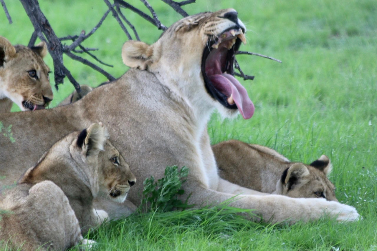 초원의 동물을 구경하기 좋은 시기는 건기인 7월에서 10월까지이다. 어제 온 비로 생긴 웅덩이로 짚이 움직이는데 어려움이 많다. 웅덩이를 피하기도 하고 흙탕을 감수하며 지나가기도 한다. 짚은 기본적으로 정해진 길로 다녀야 하며 오프로드를 하면 안 되는 것이 공원 규정이다. 공원 내에 휴게소 겸 캠프장이 있는 오카 쿠유에서 아침에 각자가 만들어 간 햄버거로 점심을 먹었다. 아침에는 추워서 사방이 열린 찦차에서 모포를 뒤집어쓰고 다녔었는데 대낮이 되니 날씨가 뜨겁다. 아프리카라도 아침저녁으로는 춥기 때문에 보온용 옷이나 바람막이를 반드시 가지고 다녀야 한다. 점심을 먹고 다시 게임 드라이브에 나섰다. 빅 4중의 하나인 코뿔소가 멀리서 풀을 뜯고 있다. 거리가 너무 멀어 망원 줌렌즈로 당겨 보니까 코뿔소의 모습을 알 수 있다. 멀어서 사진은 만족할 정도로 찍을 수 없다. 코뿔소는 검은코뿔소와 하얀 코뿔소 두 종류가 있는데 우리가 본 놈은 검은 코뿔소다. 2013년 이후 개체수 급격히 줄어 공원관리소에서 특별관리를 하고 있다고 한다. 코뿔소와 한 떼의 누우를 만난 뒤 다른 동물을 만나지 못한 채 공원을 돌고 있는데 맞은편에서 오던 드라이브 차가 사자가 있다고 위치를 알려준다. 급히 사자가 있다는 쪽으로 달려가는데 빗방울이 떨어지더니 세찬 빗줄기로 바뀐다. 비는 점점 더 거세게 내리고 지평선에서는 번개가 수없이 초원으로 내리 꽂히며 엄청난 천둥을 몰고 온다. 비닐 천막을 내려도 비는 차 안으로 들이친다. 다들 옷이 젖는데 어쩔 수가 없다. 우리 가이드는 비가 오는 중에도 사자가 있다는 곳으로 차를 몰고 간다. 빗속에서 사자가 있는 곳에 도착하니 수사자 한 마리와 암사자 두 마리 그리고 새끼 4마리가 있다. 암사자 두 마리가 새끼 4마리를 데리고 나무 밑에서 비를 피하며 휴식을 취하고 있고 수사자는 근처 나무 밑에 앉아 주변을 살피고 있다. 암사자 중 한 마리가 가끔씩 입을 벌리고 하품을 하는데 녀석의 송곳니 하나가 없다. 송곳니가 없으니 사냥할 때 어려움이 많을 듯하다. 새끼들은 엎드려 있는 암사 자위를 오르내리며 장난을 친다. 어린 동물은 맹수지만 귀엽다. 빅 4중 하나인 사자를 10m가 안 되는 가까운 거리에서 볼 수 있었으니 오늘은 운이 좋은 셈이다.