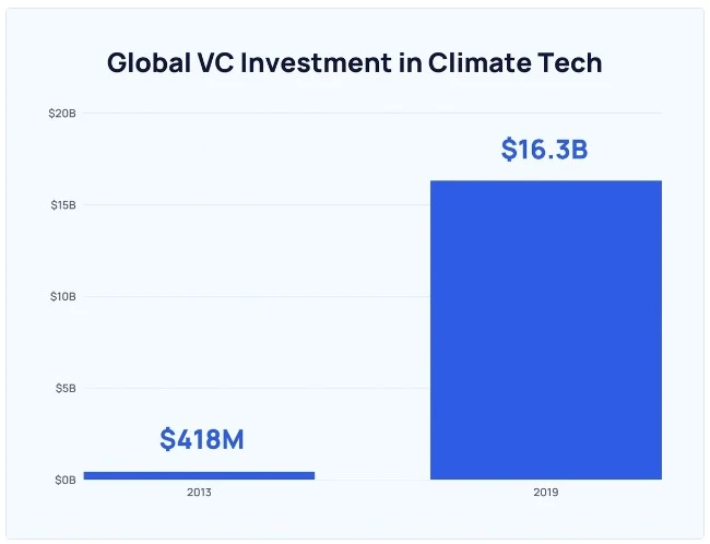 PwC의 보고서에 따르면 기후기술 스타트업에 대한 VC 투자는 다른 투자 카테고리보다 5배 빠르게 성장하고 있습니다. 이 분야에 대한 벤처 캐피털 투자는 2013년 4억 1,800만 달러에서 2019년 163억 달러로 증가하였습니다.