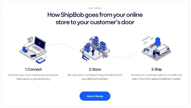 500명 이상의 직원을 고용하고 있는 ShipBob과 같은 서비스는 주문 처리 센터 네트워크에 제품 재고를 저장할 수 있습니다.