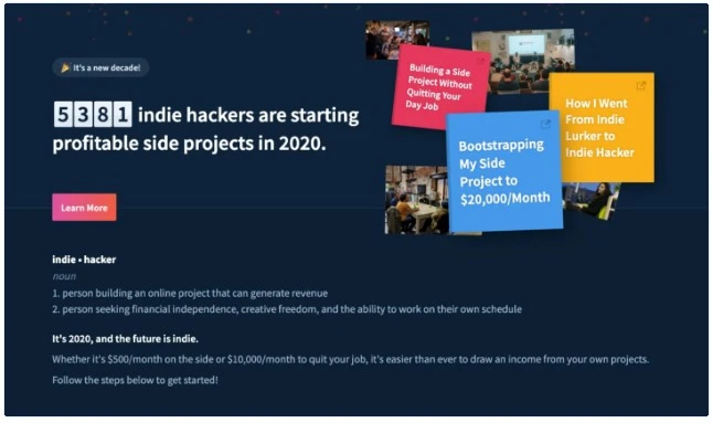 이러한 커뮤니티의 구성원은 비즈니스 전략과 성장 전략을 공개적으로 공유합니다. 좋은 예로 새로운 기업가들이 서로 성장하고 성공적인 온라인 비즈니스를 구축하는 방법을 배우는 60,000명 이상의 사용자로 구성된 빠르게 성장하는 온라인 커뮤니티인 Indie Hackers 입니다.