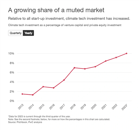 2023년에는 전체 스타트업 투자의 10% 이상이 기후 기술 기업에 투자되었습니다. 이는 2020년 7.22%보다 증가했습니다.