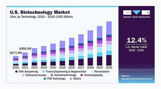 생명공학 산업의 가치는 이미 1조 3,700억 달러에 달하며 2030년까지 연평균 성장률(CAGR) 거의 14%로 성장할 것으로 예상 됩니다.
