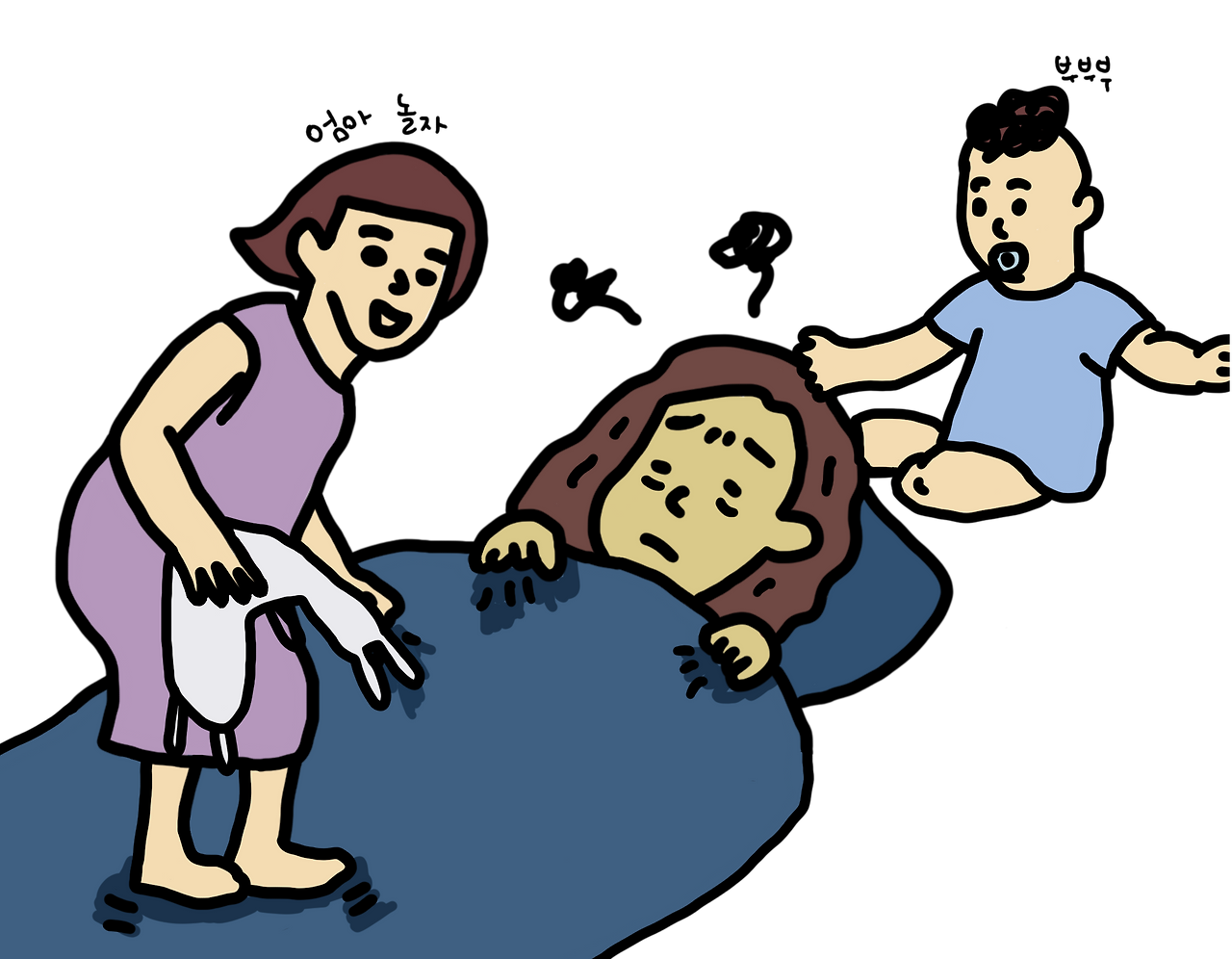 새벽 1시, 엄마가 어렵게 잠에 들자마자 기다렸다는 듯이 둘째가 깬다. 때로는 자기 침대 벽을 긁거나 쩝쩝대며 깨어 있다는 신호를 보낸다. 때로는 엉엉 울기도 한다. 엄마는 렘수면이 덜 깨서 온몸의 힘이 풀리고 비몽사몽이지만 둘째를 달래 보다가 결국 들쳐 앉는다. 제멋대로 쪽쪽이를 졸업해 버린 둘째는 이제 안아주는 것 외에 재울 방법이 없다. 침대에서 안아주고 같이 누워도 봤다가 결국 아기띠를 하고 거실로 나온다. 거실을 서성이고 소파에 앉았다가 일어나며 두어 시간을 견뎌낸다. 끝까지 잠들지 않는 둘째와 엄마는 결국 침대에 같이 눕는다. 운이 좋은 날은 눕히면 거짓말처럼 잔다. 그러면 새벽 3시다. 하지만 운이 나쁜 날은 눕혀도 끝까지 못 자고 결국 배가 고파서 우유를 달라고 엉엉 운다. 그러면 수유까지 해주고 토닥거려 다시 재운다. 그러면 새벽 4시다.