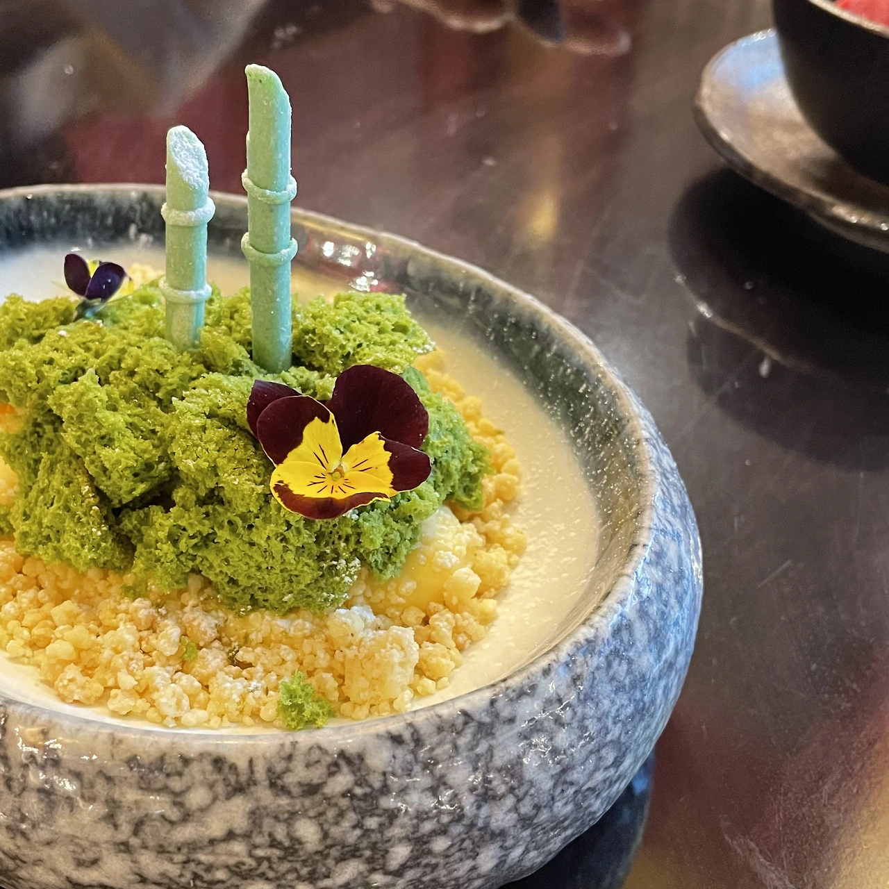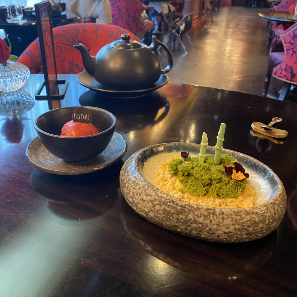 레몬 크런치와 요거트 아이스크림 위에 녹차 시폰 케이크와 대나무 모양의 초콜릿을 올려 조그마한 대나무 숲을 묘사한 앙증맞은 디저트였다. 전체적인 조화가 잘 어우러졌던 맛이었다.