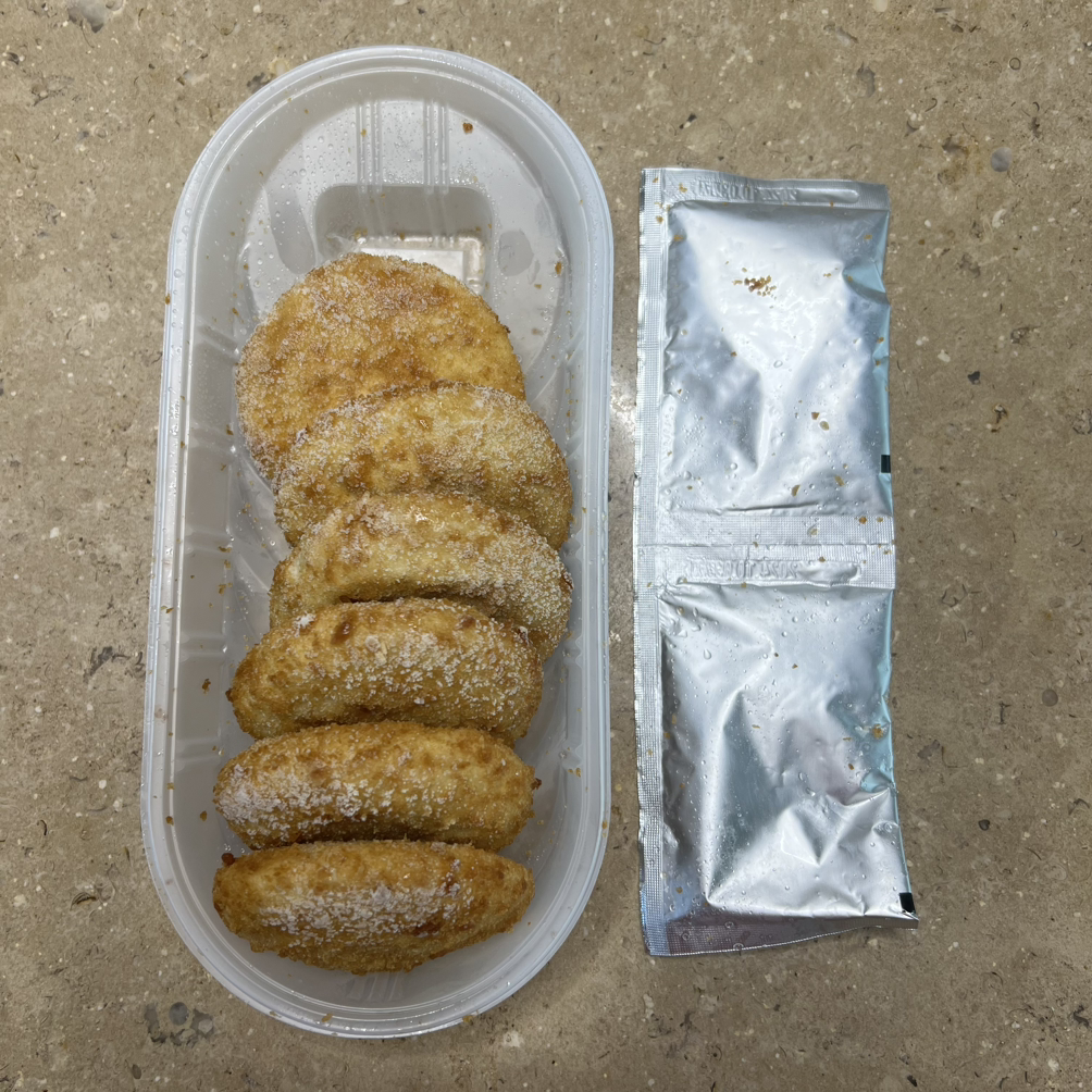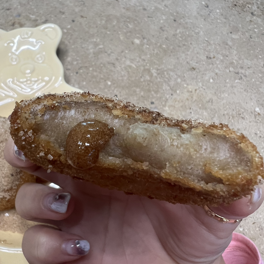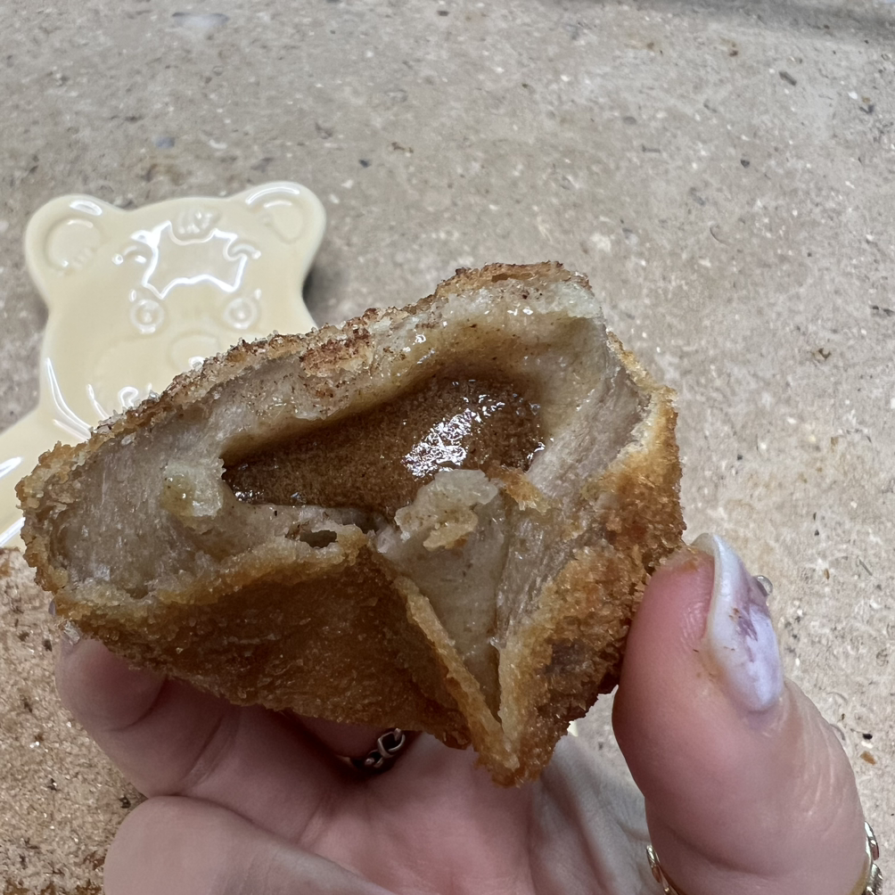 겉은 바삭한 식감을 내는 빵가루가 붙어있고 구워주면 속은 쫄깃한 찹쌀 반죽처럼 쫄깃하다. 조금 아쉬운 점은 한 입 가득 크게 물어야 속 안에 있는 설탕 시럽이 보인다. 하지만 시중에 파는 호떡도 어느 정도 베어 먹어야 시럽이 나오는 건 마찬가지이니 이해해줄 수 있다.