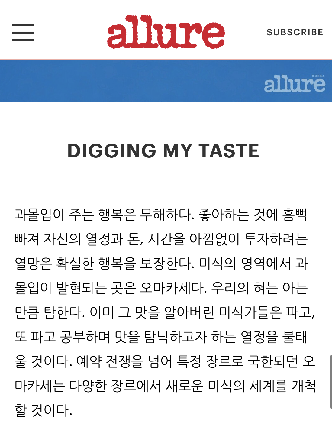 기념하고자 하는 날이 있을 때, 소중한 사람과 함께하는 식사가 조금 더 특별했으면 하는 마음이 들 때, 오마카세를 방문하여 먹으면 좋은 추억을 남길 수 있을 것 같다. 이렇게 우리의 일상에 녹아드는 중인 오마카세가 좀 더 다양한 모습으로 사람들에게 사랑을 받아 성장하기를 기대해 본다.