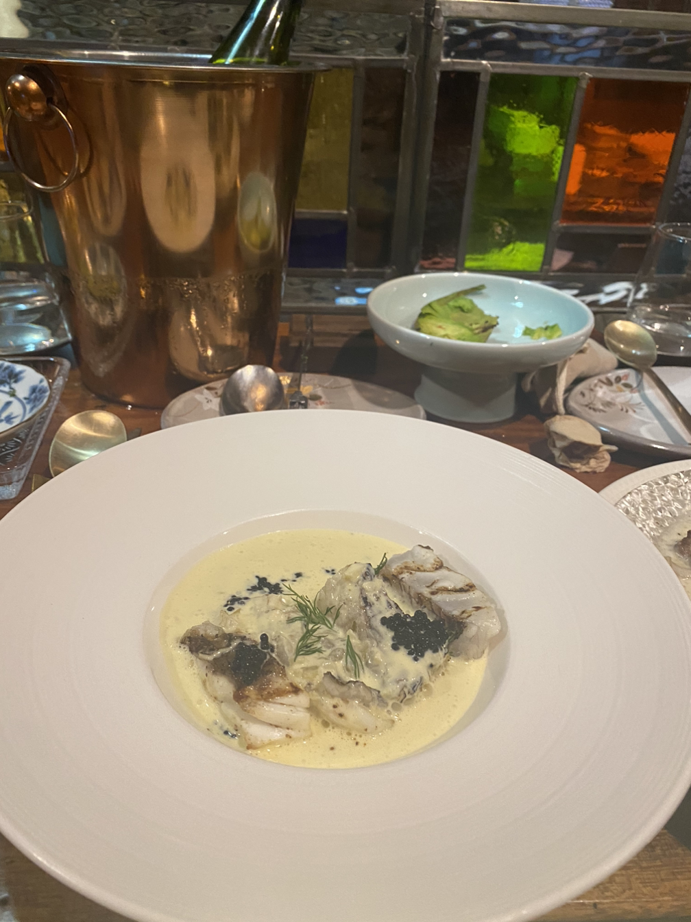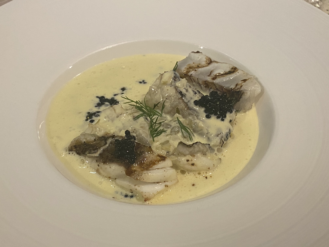 크리미 한 소소를 흰 살 생선에 끼얹어 너무 차갑지도 그렇다고 뜨겁지도 않은 적당한 온도의 반숙 흰 살 생선이 완성되었다. 참 고소했다.