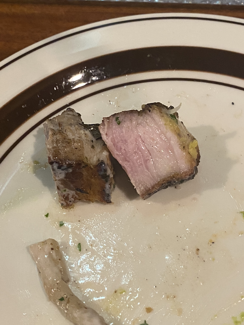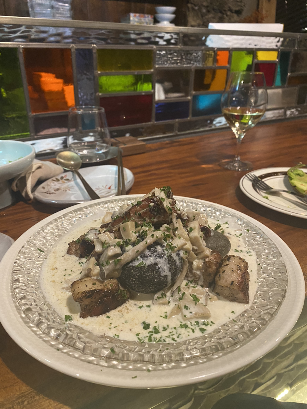 따뜻한 돌을 접시 가운데 놓아 음식을 좀 더 따뜻하게 먹을 수 있었다. 돼지고기를 크림소스와 함께 먹은 건 처음이었는데 의외로 괜찮았다. 돼지고기 특유의 부들부들하고 기름기 있는 살코기에 크림소스를 찍어 먹으니 부드러움이 이루 말할 수 없었다.