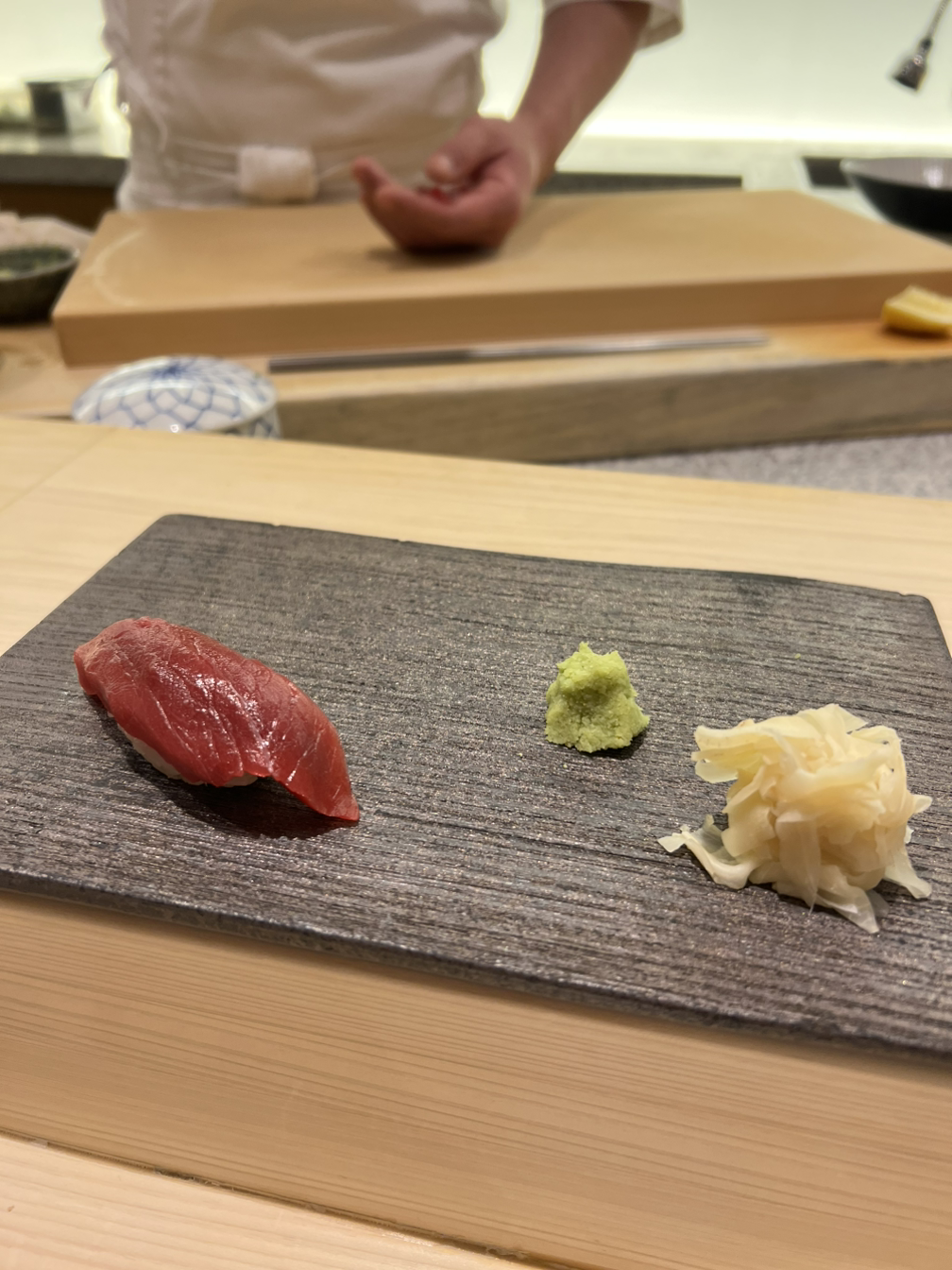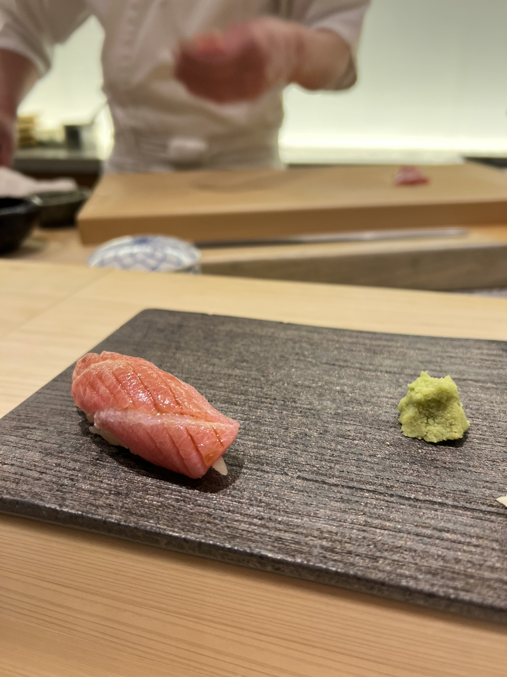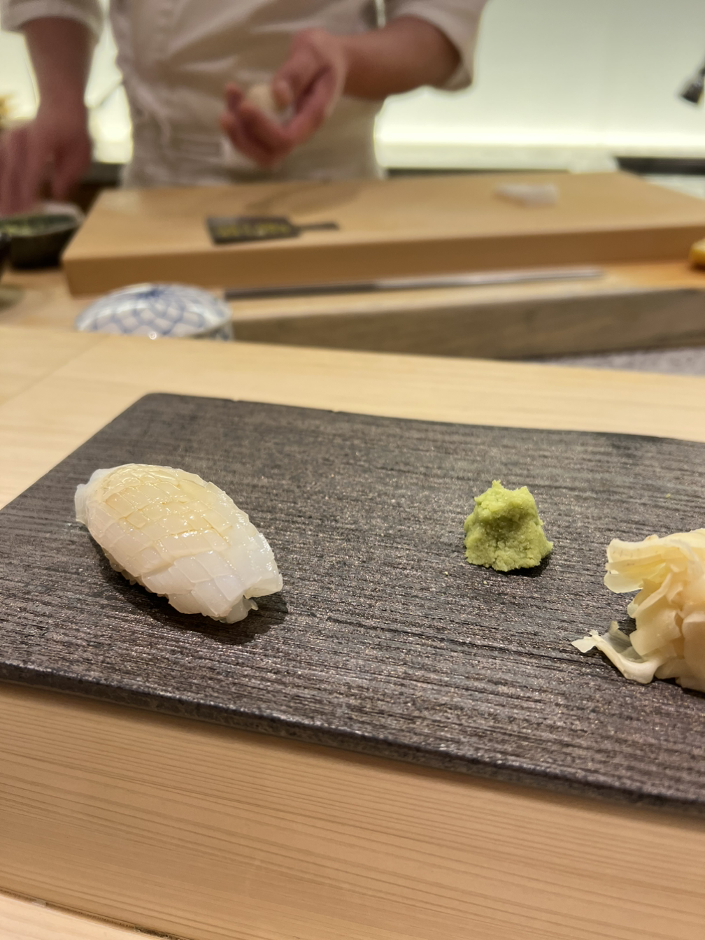 첫 코스는 단호박 맛이 느껴지는 차완무시로 시작되었다. 안에 새우살이 통통하게 들어가 있어 입맛을 완벽하게 돋우기 좋았던 메뉴였다. 단호박 퓨레처럼 달달한 맛이 들어가 계란의 느끼한 맛이 느껴지지 않아 더 좋았다. 두 번째는 도미 사시미가 나왔고 세 번째는 참돔 스시가 나왔다. 셰프님이 만드는 걸 지켜보던 유정이는 샤리 위에 초록색 채소를 찍어준 것을 보고 굉장히 신선하게 느껴졌다. 위에 토핑으로만 사용했던 실파를 밥과 생선 사이에 넣어 먹다니! 역시 다양한 음식을 먹어보아야 다양하게 활용할 수 있다는 점을 깨달은 그녀였다. 어떻게 보면 스시라는 메뉴 자체가 한국인에겐 느끼하게 느껴질 수 있는데 코스에 한 번씩 후레쉬한 채소들을 넣어주어 더 맛있었다.