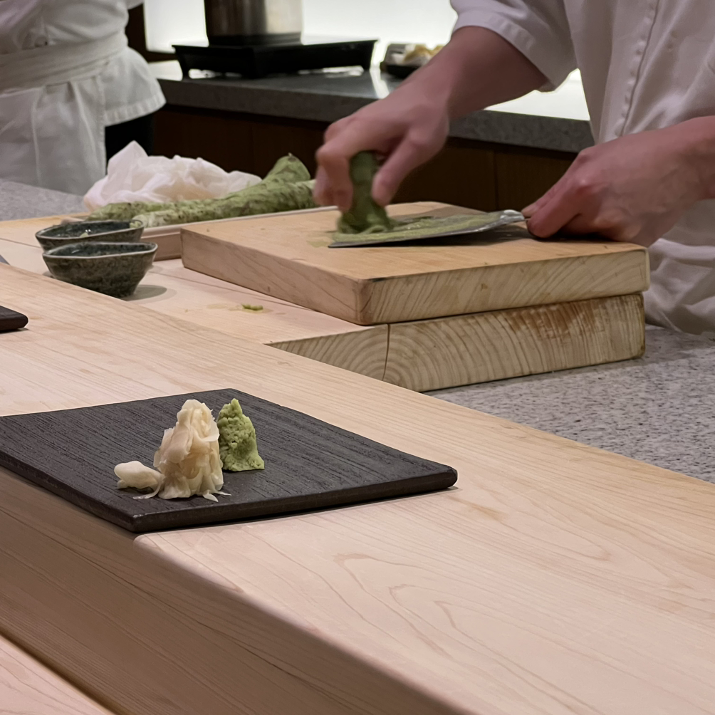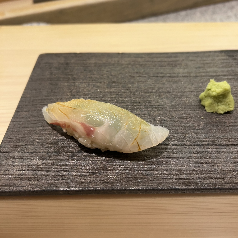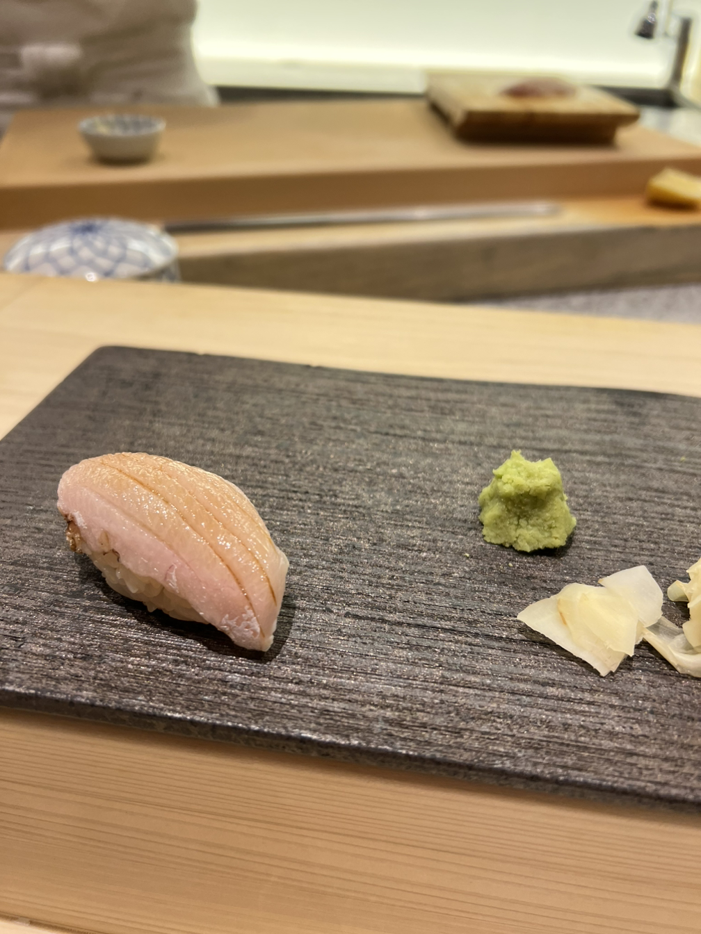 첫 코스는 단호박 맛이 느껴지는 차완무시로 시작되었다. 안에 새우살이 통통하게 들어가 있어 입맛을 완벽하게 돋우기 좋았던 메뉴였다. 단호박 퓨레처럼 달달한 맛이 들어가 계란의 느끼한 맛이 느껴지지 않아 더 좋았다. 두 번째는 도미 사시미가 나왔고 세 번째는 참돔 스시가 나왔다. 셰프님이 만드는 걸 지켜보던 유정이는 샤리 위에 초록색 채소를 찍어준 것을 보고 굉장히 신선하게 느껴졌다. 위에 토핑으로만 사용했던 실파를 밥과 생선 사이에 넣어 먹다니! 역시 다양한 음식을 먹어보아야 다양하게 활용할 수 있다는 점을 깨달은 그녀였다. 어떻게 보면 스시라는 메뉴 자체가 한국인에겐 느끼하게 느껴질 수 있는데 코스에 한 번씩 후레쉬한 채소들을 넣어주어 더 맛있었다.