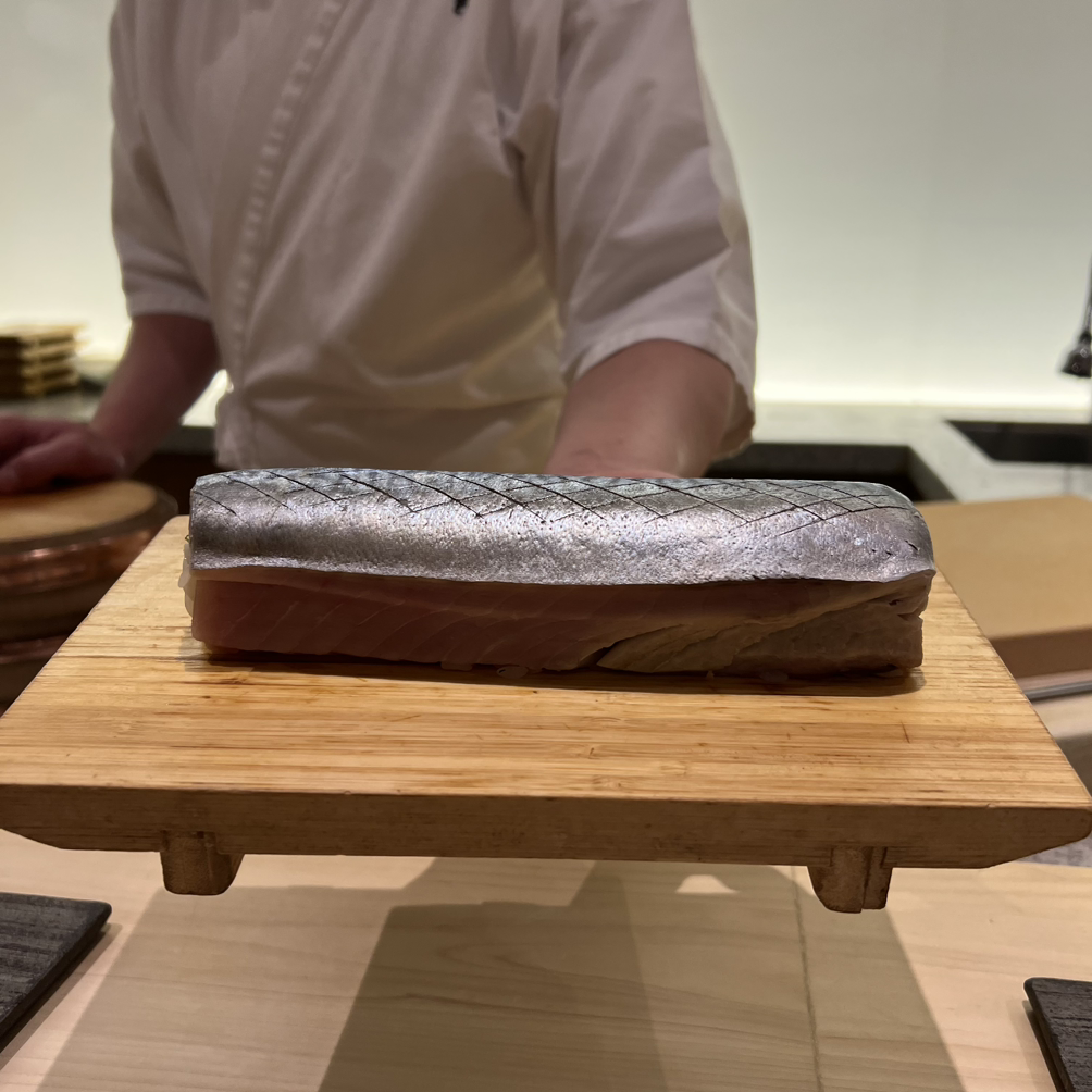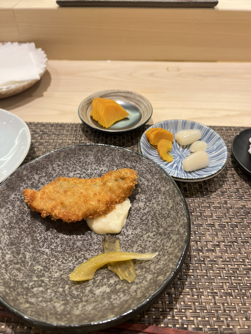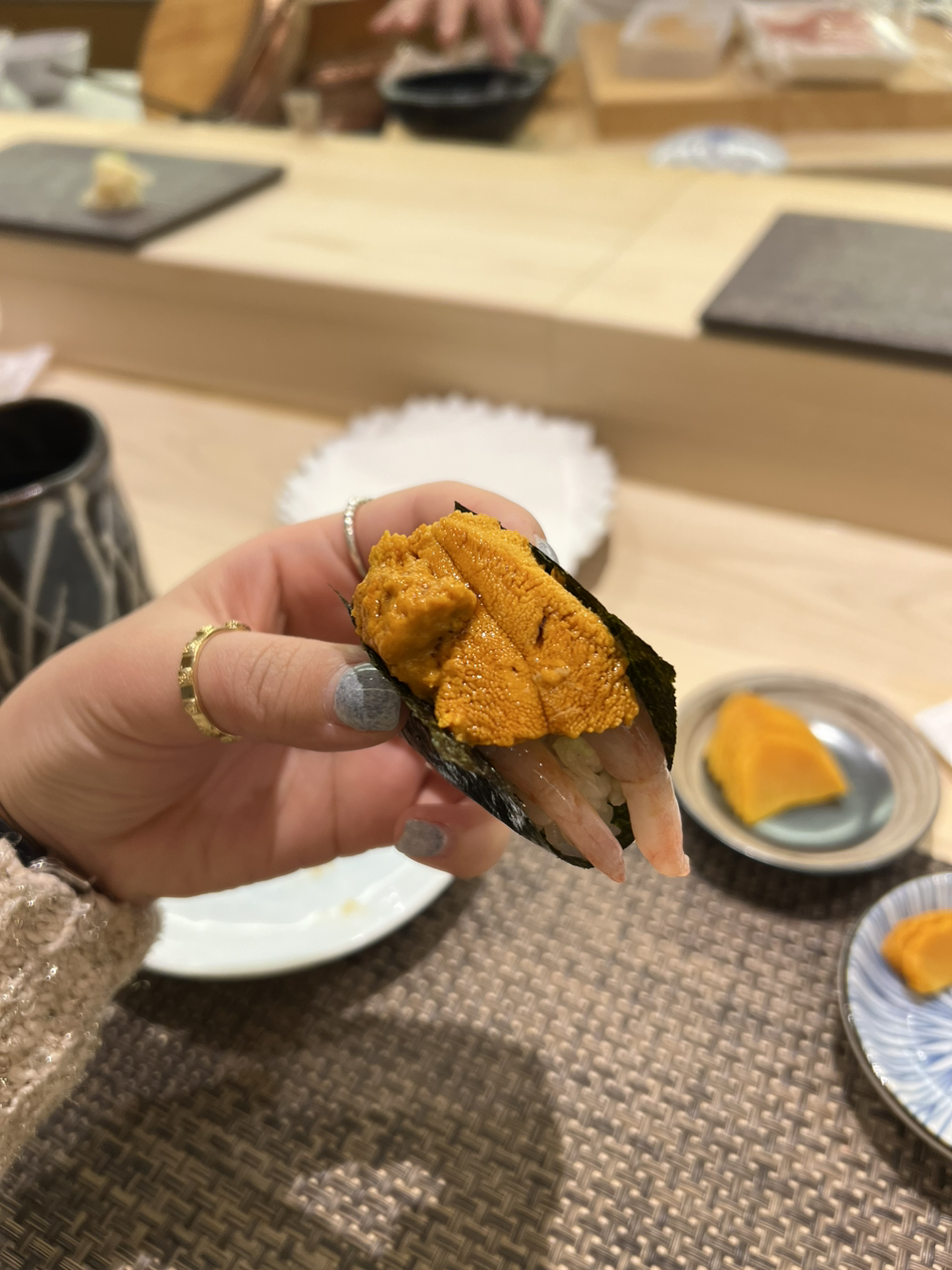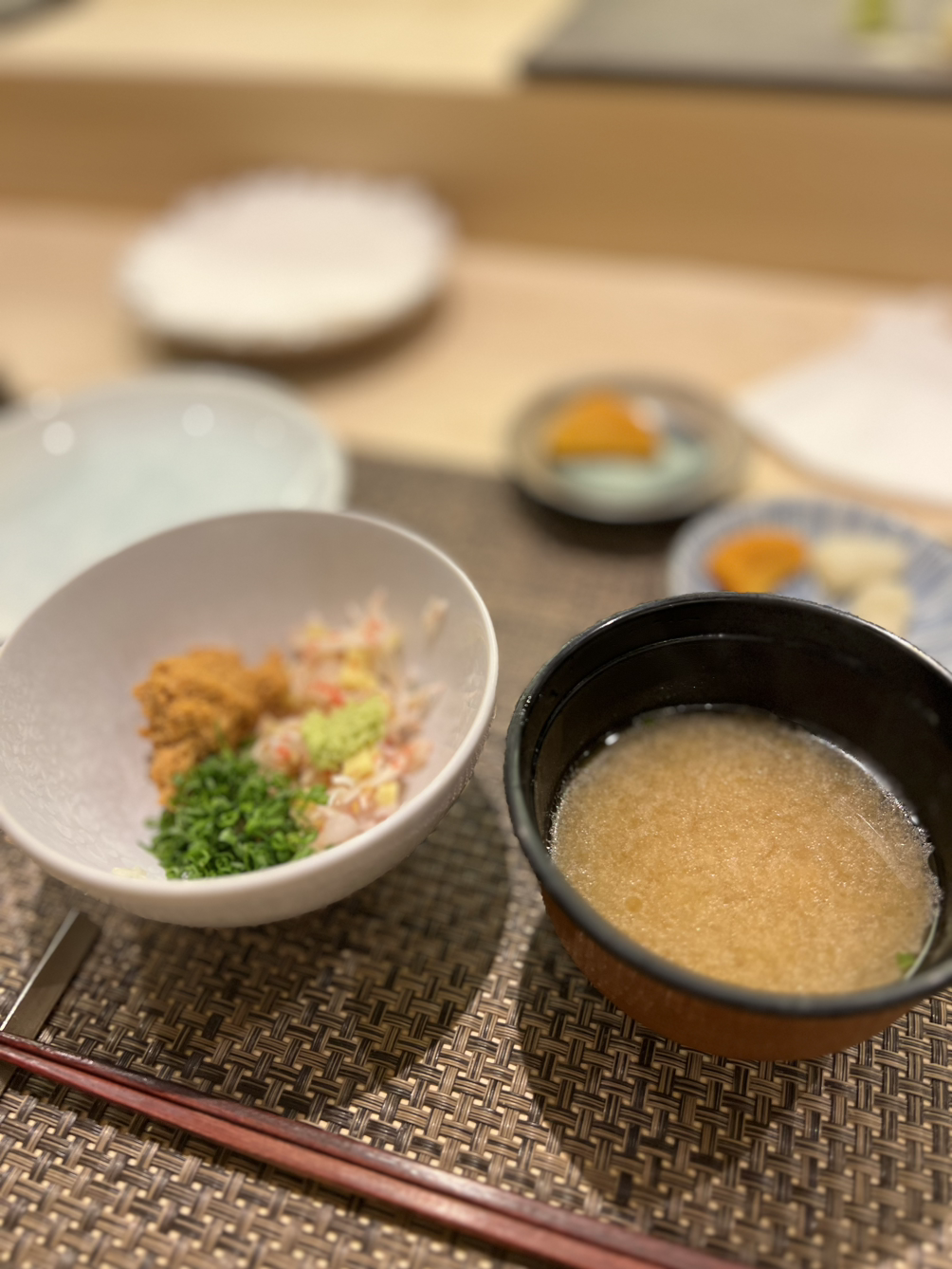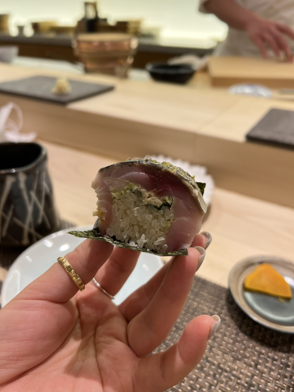 참치 뱃살, 한치, 참치 등살 순으로 제공이 되었고 토치로 한번 그을린 방어 스시도 입 안에서 불향이 가득 느껴져 이 음식을 먹는 행위 자체가 행복하게 느껴졌다. 스시뿐만 아니라 삼치살튀김이 나왔고 그다음으로 ‘자본주의 스시’인 단새우&우니 스시도 제공되었다. 김 안에 샤리, 단새우, 우니 순으로 싸서 나왔는데 이 맛은.. 천국에서 느낄 수 있는 맛이라고 하면 더 깊게 와닿을까 라는 생각을 한다. 전혀 비리지 않고 단새우의 달달한 맛이 우니의 맛을 잡아주고 샤리의 짭조름한 맛이 우니의 고소한 맛을 더 잘 느껴지게 한다. 그리고 스시소라의 시그니처라고 할 수 있는 고등어김초밥이 제공되었다. 고등어 살 안에 샤리, 참치마요, 시소무침을 넣고 돌돌 말아 만든 김초밥으로 깻잎과는 조금 다르지만 특유의 향은 느껴지는 듯했다. 그 향이 고등어의 비린내를 잡아주어 감칠맛이 최고였다.