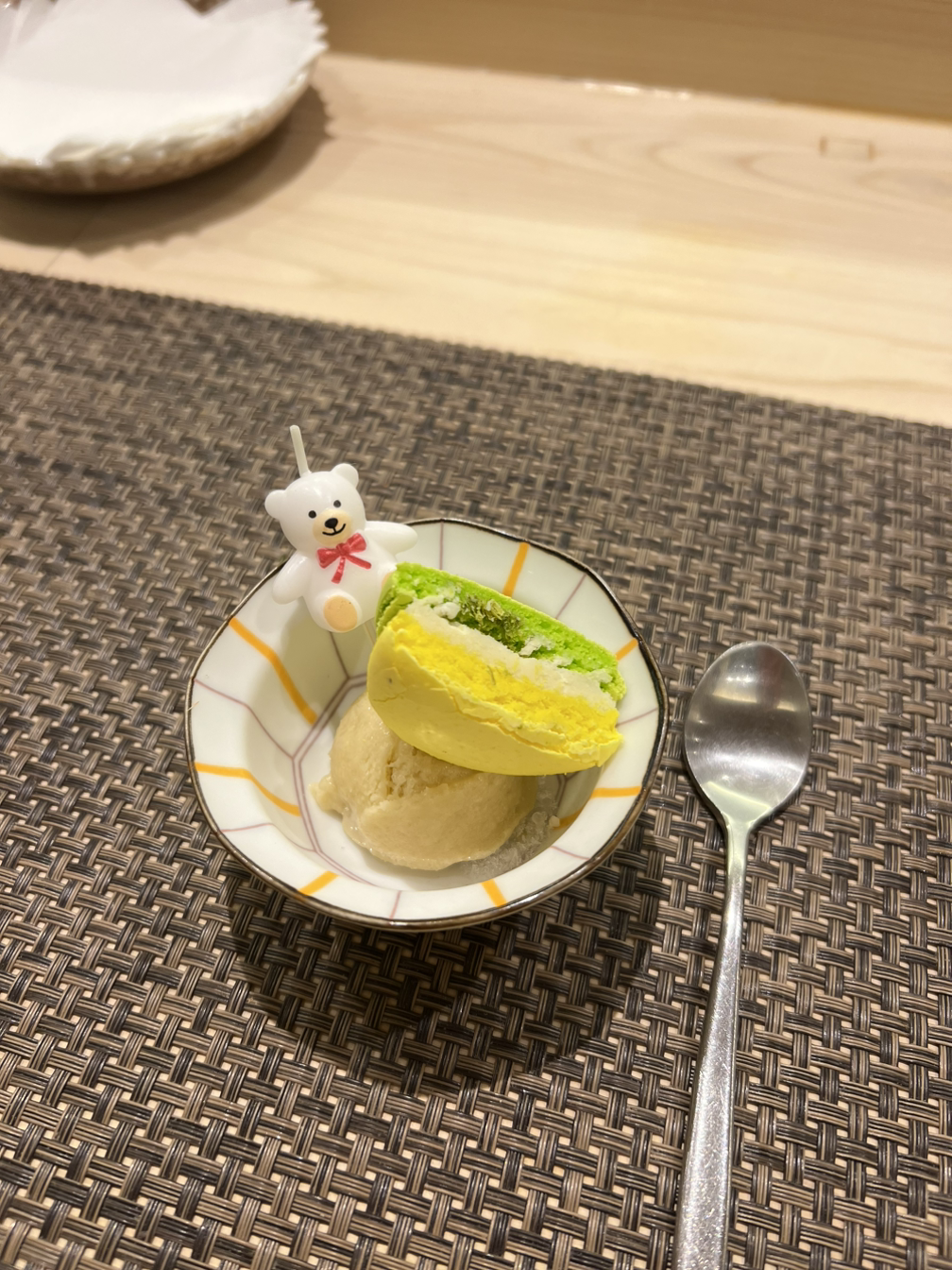 다음으로 지라시스시가 제공되었다. ‘지라시 스시’는 흩뿌린 초밥이라고 해석할 수 있는데 뭉치지 않고 생선회와 여러 재료를 흩뿌리 듯 올려 만드는 것이 특징이다. 스시소라의 지라시스시는 생새우, 계란노른자, 게살, 아귀 간, 와사비가 올려져 있었는데 일본의 고급 김에 싸 먹는 맛이 좋았다. 하지만 유정이는 아귀 간 특유의 미끌거리는 맛이 별로여서 J에게 떠넘기 듯 줬다고 한다. 그리고 전갱이와 바다장어가 제공되었고 마지막으로 큼직한 후토마끼가 제공되었다. 후토마끼는 양 옆으로 꼬다리가 나오는데 셰프님이 “꼬다리 드실 분?”이라고 물어보길래 J의 옆구리를 쿡쿡 찔렀다. 유정이 덕분에 큰 꼬다리를 득템 한 J는 입 터지게 즐겼다. 그리고 면이 얇은 고쿠와 우동과 크리스마스라고 귀여운 초가 꽂아진 얼그레이 샤베트가 제공되었다. 디저트까지 먹기 위해 수많은 코스를 지나왔는데, 정말 정말 유정이의 배는 터질 것 같았지만, 이 배부름이 너무 즐거워 보인다.