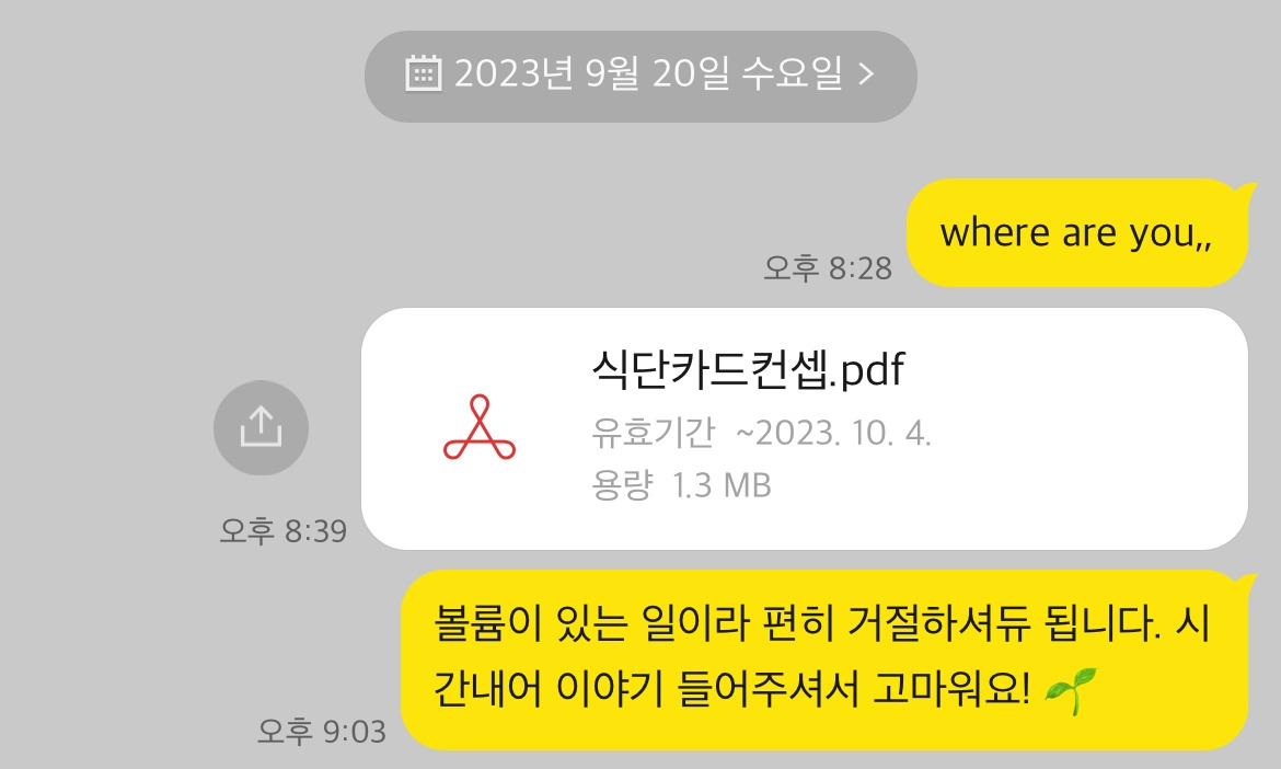 내가 기획을 하고 그녀가 그림을 그리면 어떨까. 겨우 시바견 이야기 한번 튼 사이였지만, N력이 90쯤 되는 내 머릿속에는 우린 이미 도원결의 협의체가 되어있었다. 되든안되든 물어봐야겠다는 생각으로 A4 2장짜리 '운동카드 식단카드 제작 기획서'를 만들었다. 없는 것을 만들어 내는 것은 나의 전문 분야이니까. 손에 잡히지 않는 소프트웨어에 갑갑증이 난 상태였기에, 실물이 잡히는 '카드'라는 물건은 내게 몹시 매력적인 소재였다. 기획서가 대강 갈무리 되어 .pdf 내보내기를 하던 시점에 나는 핸드폰을 열어서 그녀에게 DM을 보냈다. (내게 이런 용기가 있는 줄은 나도 몰랐다.)