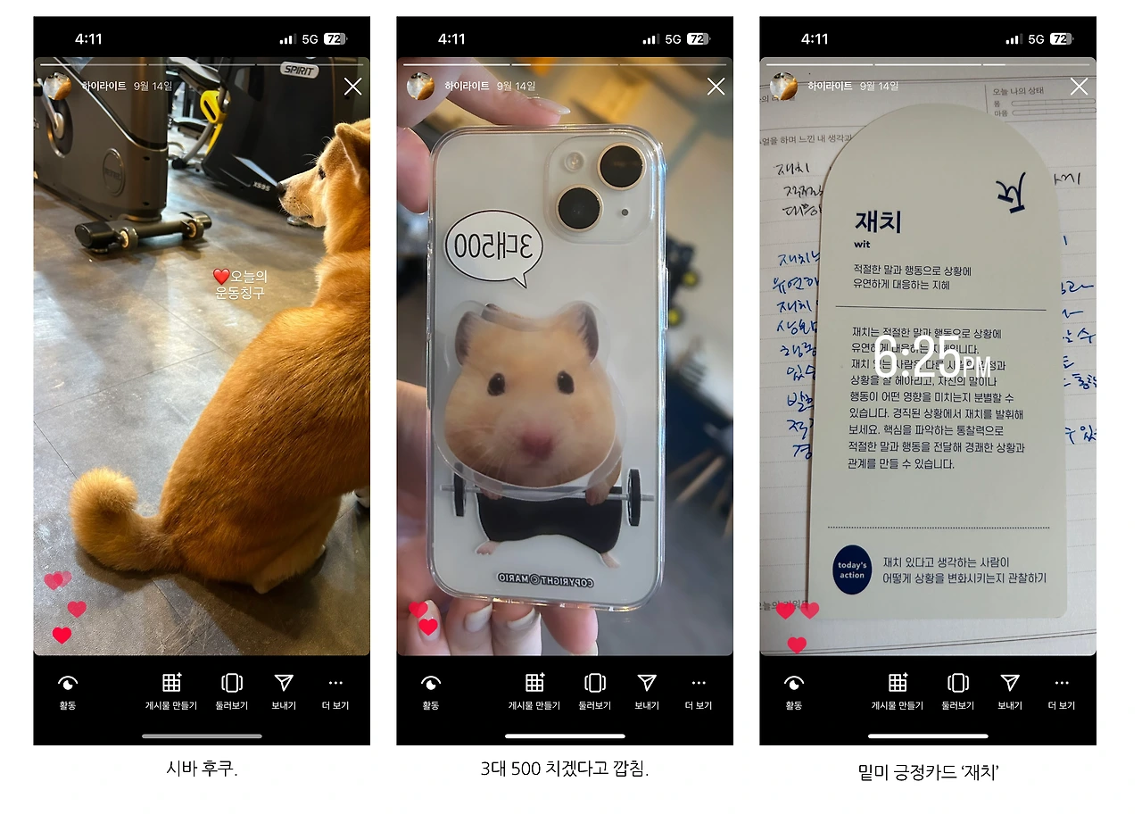 당시 나는 '월간 운동 계획'과 '긍정카드 필사'에 꽂혀있었는데, (앞서 말했지만, 무엇인가에 집착하는 이는 사실을 그걸 갖지못한. 내겐 심적/신체적 동력이 필요했다.) 월간 운동 계획은 웨이트/등산/러닝/요가를 한 달의 화이트보드형 달력에 잘 분배하고 실행 후 체크하는 작업이었다. 또, 긍정카드는 '밑미'라는 리추얼 플랫폼에서 나온 긍정적인 마음들 40여가지가 적혀있는 카드로 나는 아침마다 출근 전에 그날 마음에 차는 카드를 고르고 따라 쓰고 스토리에 인증하는 것이 하루의 즐거움이었다. (그 중 가장 좋아하는 카드는 '재치'와 '분별력'. 여전히 때때로 카드덱을 넘기며 읽거나, 따라 쓰는 일을 좋아한다.)