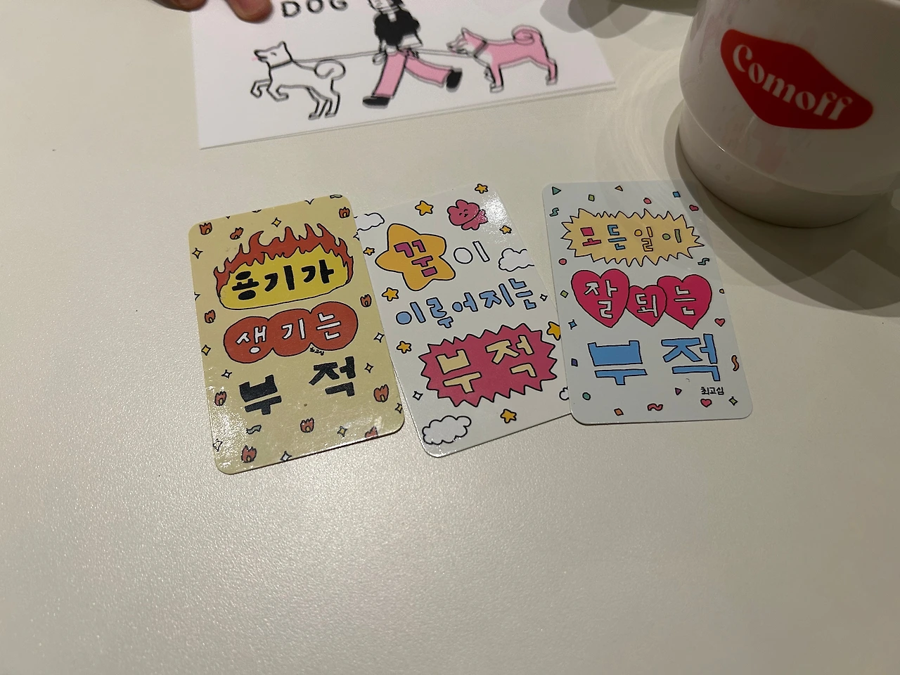 우리는 각자의 장난감 부적을 소중히 가담으며 자리를 일어섰다. 재치 넘치는 '최고심 부적' 너머로 알 수 없는 투지가 컴오프커피를 감돌았다. 더이상의 퇴로는 없다. 두 사람은 꿈을 좇아 생의 저점으로 투신하겠다는 다짐을 소리없이 나누었다. 그리고 나는 그 날을 '비사벌콩나물국밥 용기맛'으로 기록했다.