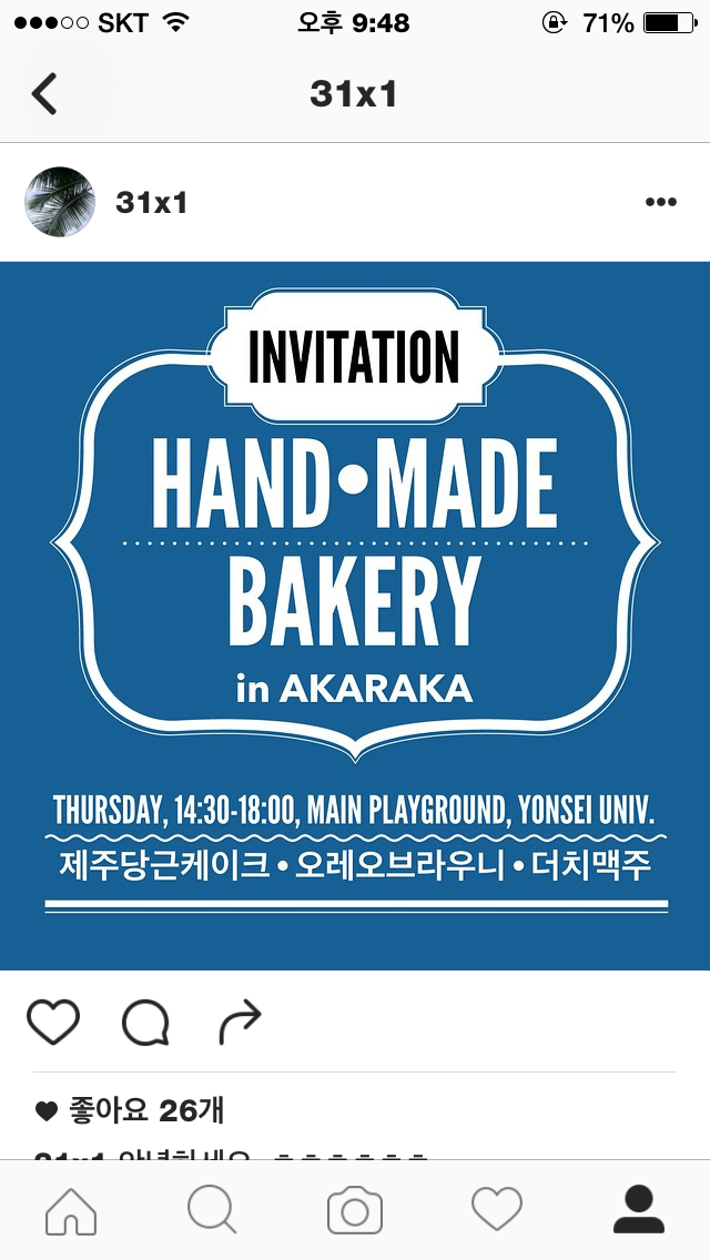 다음날, 빵 굽기와 잠을 교환하고서, 축제라면 피곤함에 고개를 짤짤 거리던 할머니 학번 세명이 대운동장 한쪽에서 당근케이크, 오레오 브라우니, 더치 맥주를 팔았다. 이것을 팔아서 밑천을 하겠다는 일념으로 포스터도 만들고 가판도 열심히 꾸며서 호객행위도 했다. 지인 강매 절반 판매 절반으로 당케오케맥은 중박을 치고서 일일천하의 셔터를 내렸다.
