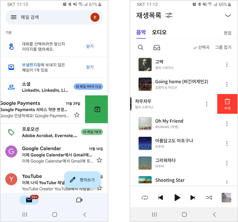 Gmail 앱과 FLO 앱의 스와이프로 리스트 삭제하기