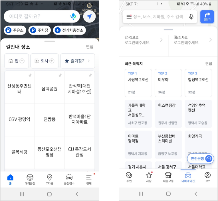 TMap 앱과 네이버 지도 앱의 메인 화면
