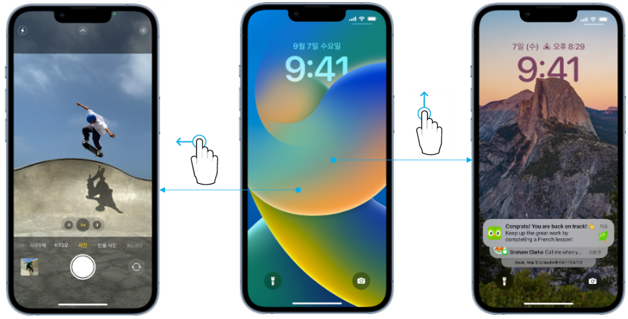 아래의 그림은 아이폰의 잠금 화면인데요. 화면의 하단을 보면 순간 포착이 중요한 카메라 앱과 함께 어두운 환경에서 즉시 실행이 필요한 손전등 기능이 숏컷으로 제공됩니다. 잠금 화면에서 개인 인증을 풀고 홈 화면으로 진입한 후, 카메라 앱이나 제어 센터로 진입한 후 기능을 실행하지 않아도 사용자는 제스처를 통해 바로 해당 기능들에 접근할 수 있습니다. 뿐만 아니라 잠금화면에서 사용자가 자주 사용하는 이전 알림 정보를 확인하기 위해서도 제스처를 통해 바로 접근할 수 있습니다.