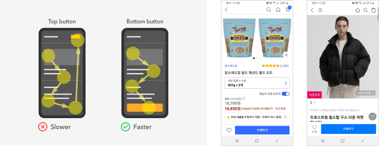 좌: 모바일 환경에서의 쿠텐베르크 법칙 적용 (출처. uxmovement), 우: 쿠팡 및 무신사 앱 화면