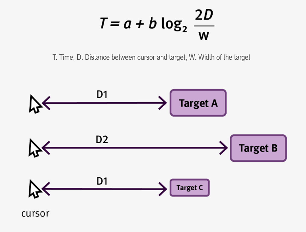 기능을 실행하기 위해 여러 단계를 거쳐야 하는 과업을 디자인할 때에는 사용자의 조작 동선을 배려해 버튼 배치를 최적화하여야 합니다. 이와 관련된 피츠의 법칙(Fitts’ Law)에 따르면, 타겟과의 거리(D)가 멀어지거나 타겟의 크기(w)가 작으면 동작 시간(T)이 늘어나게 되는데요. 예를 들면 아래의 Target A는 Target B와 크기는 같지만, Target A가 Target B보다 Cursor가 위치한 시작점과의 거리가 가깝기 때문에 사용자는 더 빨리 누를 수 있습니다.