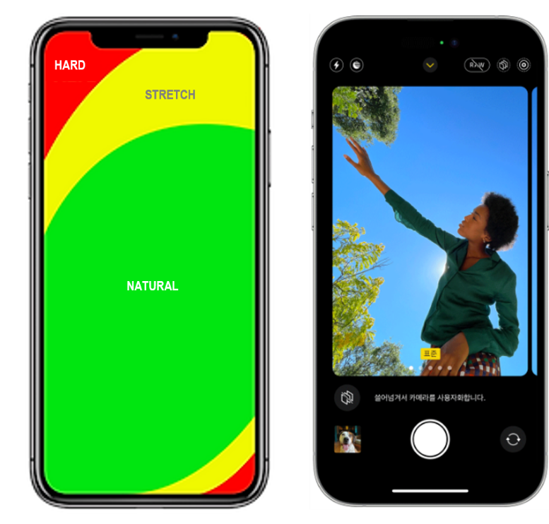 또 다른 예로 아래 그림은 순간 포착이 중요한 스마트폰 카메라 화면인데요. 한 손으로 사진을 촬영할 때 엄지가 위치하는 하단 영역(조작이 쉽고 빠른 그린 영역)에 촬영 버튼이 배치되어 있기 때문에, 사용자가 원하는 타이밍에 엄지로 버튼을 눌러 빠르게 촬영할 수 있습니다.