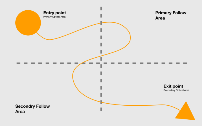 화면의 레이아웃을 디자인할 때, 정보 파악을 위한 시선과 조작을 위한 물리적 동선을 최적화해 사용자에게 요구되는 불필요한 행동을 줄여주어야 합니다. 쿠텐베르크 법칙(Gutenberg Rule)에 따르면, 아래 그림과 같이 사용자는 정보를 스캔할 때 좌측 상단에서 시작해서 우측 하단으로 시선이 이동하게 되는데요. 이러한 사용자의 지각적 특성을 배려하여 상단에는 정보를 배치해 자연스럽게 파악하게 하고, 하단 쪽에 최종적인 선택을 할 수 있는 버튼을 배치하는 것이 과업을 수행하는 데에 효율적일 수 있습니다.