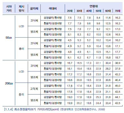 이러한 시니어의 노안을 배려하여 좀 더 높은 시인성을 가진 정보를 서비스에 제공하는 것이 필요할 텐데요, 그렇다면 어느 정도의 크기로 정보가 제공되는 것이 필요할까요? 아래 표와 같이 60~70대의 시니어의 원활한 서비스 이용을 위해서는 20대~40대와 대비하여 약 1.5~2배의 글자 크기 필요합니다.