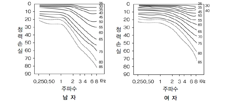 시니어의 노화는 청각 능력 감퇴로도 이어집니다. 고령이 되면서 작은 소리와 높은 음이 잘 들리지 않게 되는데요. 이를 노인성 난청이라 합니다. 아래 그래프와 같이 50대 이상이 되면 3㎑ 이상의 고음역은 청력 손실이 진행되기 때문에, 오히려 중·저음의 소리가 잘 들리게 됩니다. 이와 관련하여 KS P 1503(고령자 및 장애인 배려 설계 지침 소비생활제품의 알림 신호음)에 따르면, 알림 신호음의 주파수는 2.5㎑를 초과하지 않을 것을 제시하고 있습니다.