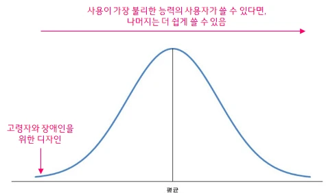 누구나 쓸 수 있도록 디자인하는 방법은 무엇일까요? 서비스 이용에 가장 불리한 능력을 가진 사용자층을 배려해 디자인한다면, 그들 뿐만 아니라 나머지의 보통의 사람들도 충분히 사용할 수 있을 것입니다. 이러한 개념은 인체 측정치 응용 원리 중 극단치 설계의 개념과 일맥상통하는데요, 아래 그림과 같이 고령자나 장애를 가진 사용자와 같이 서비스 사용에 불리한 능력을 배려한 디자인을 한다면, 나머지의 더 나은 능력을 지닌 사용자들은 그들보다 더 쉽게 쓸 수 있을 텐데요. 이러한 디자인적 배려를 통해 누구라도 쓸 수 있는 서비스가 될 수 있습니다.