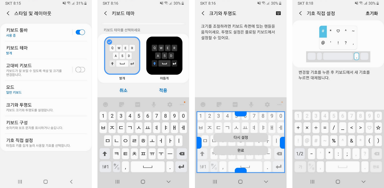 다음으로 아래의 그림은 스마트폰의 터치 키보드의 커스터마이징 기능인데요. 단순히 자기 취향에 맞도록 테마를 설정할 수 있는 것뿐만 아니라, 자신의 손 크기에 맞도록 키보드 크기를 조절할 수 있습니다. 또한 나만의 사용 습관에 효율적으로 사용할 수 있도록 자주 사용하는 기호를 직접 커스터마이징할 수 있습니다. 이를 통해 사용자는 자기만의 감성을 표현할 수 있는 키보드를 사용할 수 있을 뿐만 아니라, 내 손에 딱 맞는 키보드 입력을 통해 높은 사용성을 경험할 수 있습니다.