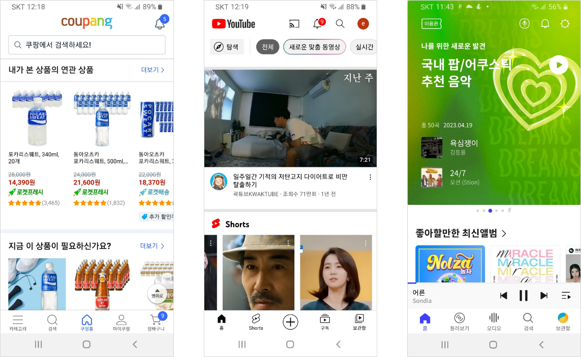 좌: 쿠팡 홈 화면, 중앙: 유튜브 홈 화면, 우: Flow 홈 화면