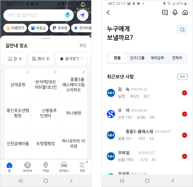 그렇다면 개인화 추천 UX는 어떻게 제공해 줄 수 있을까요? 가장 단순한 방법은 최근에 사용하였거나 가장 많이 쓴 이력을 기억하였다가 이를 사용자에게 추천해 주는 것 입니다. 특히 아래 그림의 목적지를 입력하거나 계좌 번호를 입력하는 과업과 같이, 사용자가 자주하거나 반복적으로 발생하는 루틴(Routine)한 과업에 대해 최근 이력을 추천해 주는 것은 효과적일 수 있을 텐데요. 이를 통해 사용자는 번거로운 입력 과정을 생략할 수 있을 뿐만 아니라, 기억의 부담도 줄여 줄 수 있습니다.