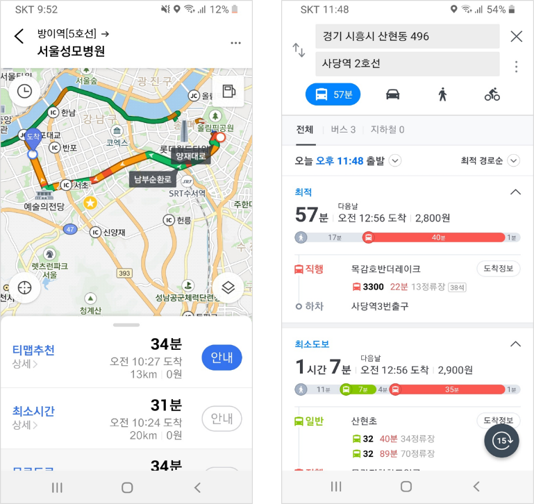 좌: TMAP 경로 추천, 우: 네이버 지도 대중 교통 최적 경로