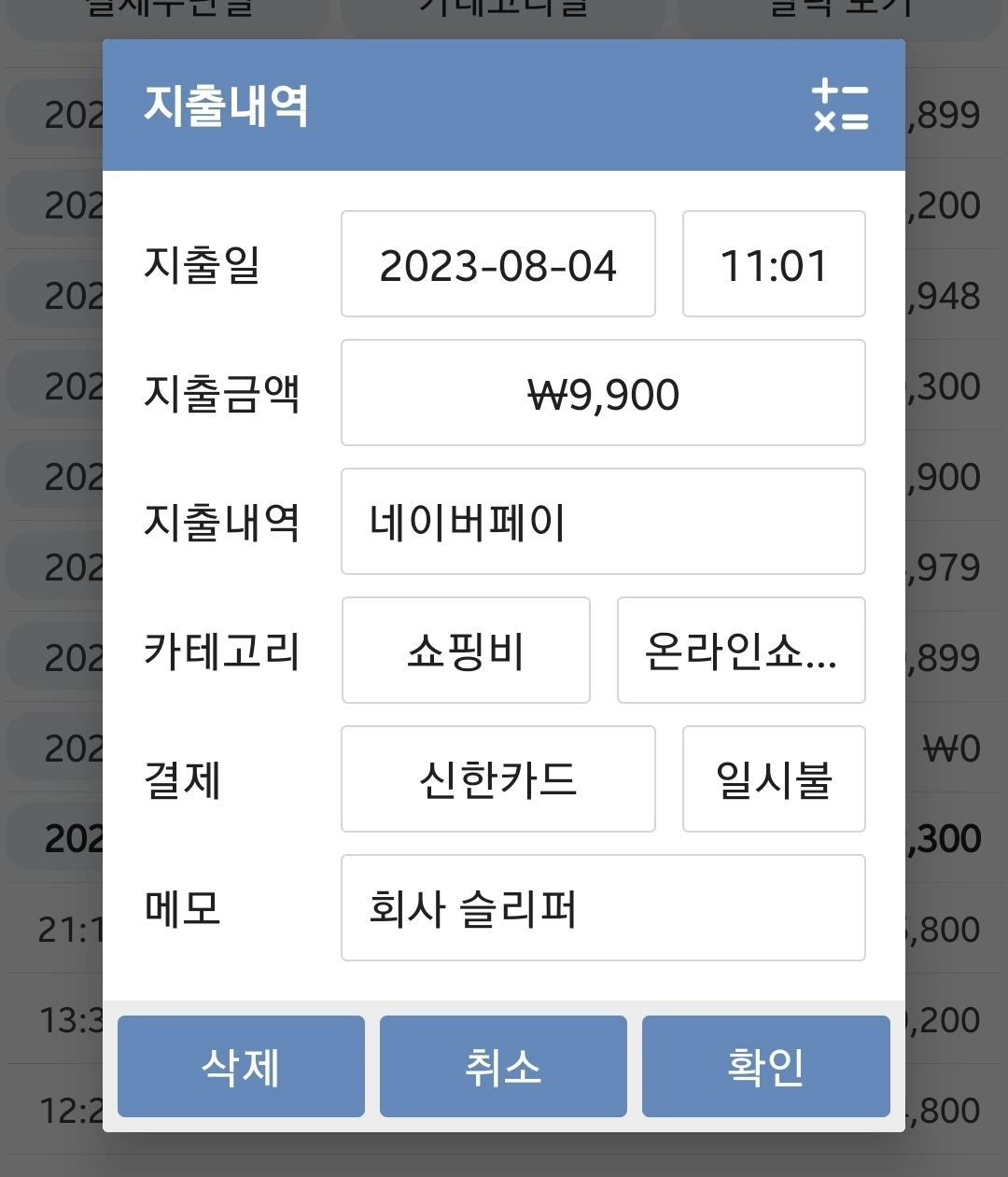바로 이런식으로 말이다. 시간이 지나면 점점 더 기억은 희미해지기 때문에 지출 후에 바로바로 메모를 적어두는 습관을 들이는 것이 좋다.